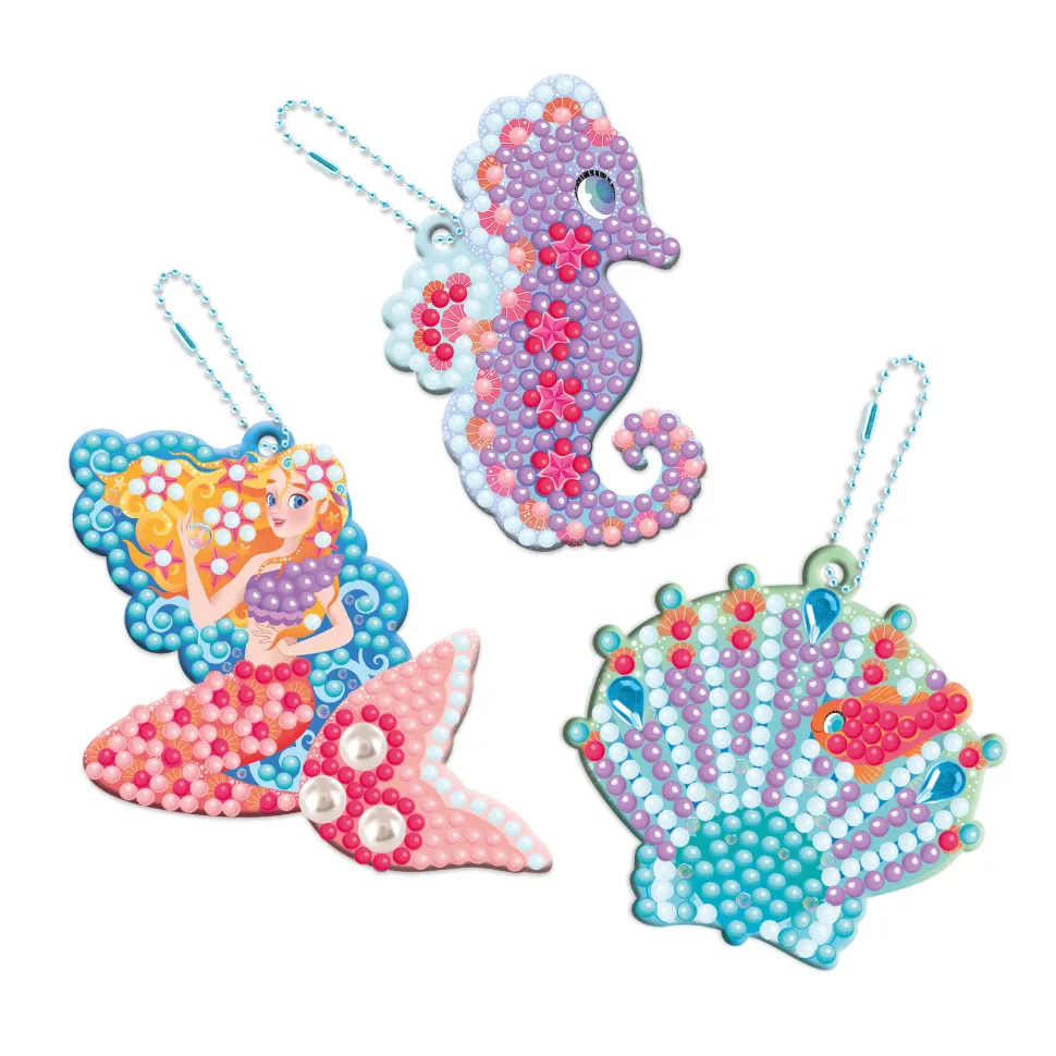 Des porte-clés à accrocher partout ! Ce coffret créatif permet de réaliser 3 porte-clefs à l’aide de mini-strass, sur la thématique de l’océan. Il contient 3 porte-clefs autocollants, 3 chaînes, 10 strass, 700 mini strass, 1 stylet, 1 carré de cire et 1 coupelle. Les instructions et les modèles sont imprimés à l’intérieur de la boîte. Cette activité permet de développer sa patience et sa créativité et nécessite environ 20 minutes par porte-clés. Elle est idéale pour les enfants à partir de 7 ans.