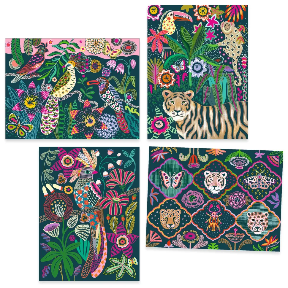 Une pochette de 4 cartes à gratter avec couleur fluo dans une ambiance chatoyante. L’enfant reproduit les motifs imaginés par l’artiste en grattant la surface à l’aide du stylet en bois. Progressivement, les illustrations sont révélées comme par magie !