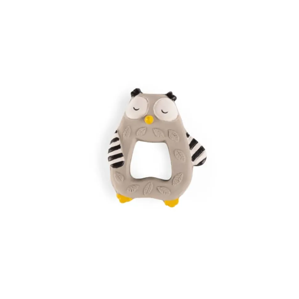 Anneau en caoutchouc 100% naturel, issu de la sève d’Hévéa, à l’effigie de Monsieur Hibou, ami du trio moustachu ! Pour soulager les dents de bébé ou jouer dans le bain, il n’a ni trou ni sifflet pour éviter l’accumulation de saletés à l’intérieur.
