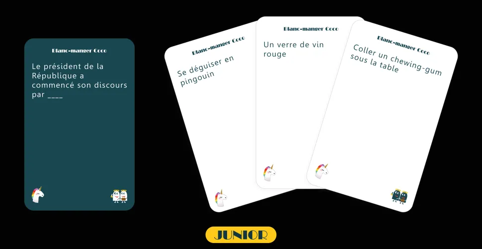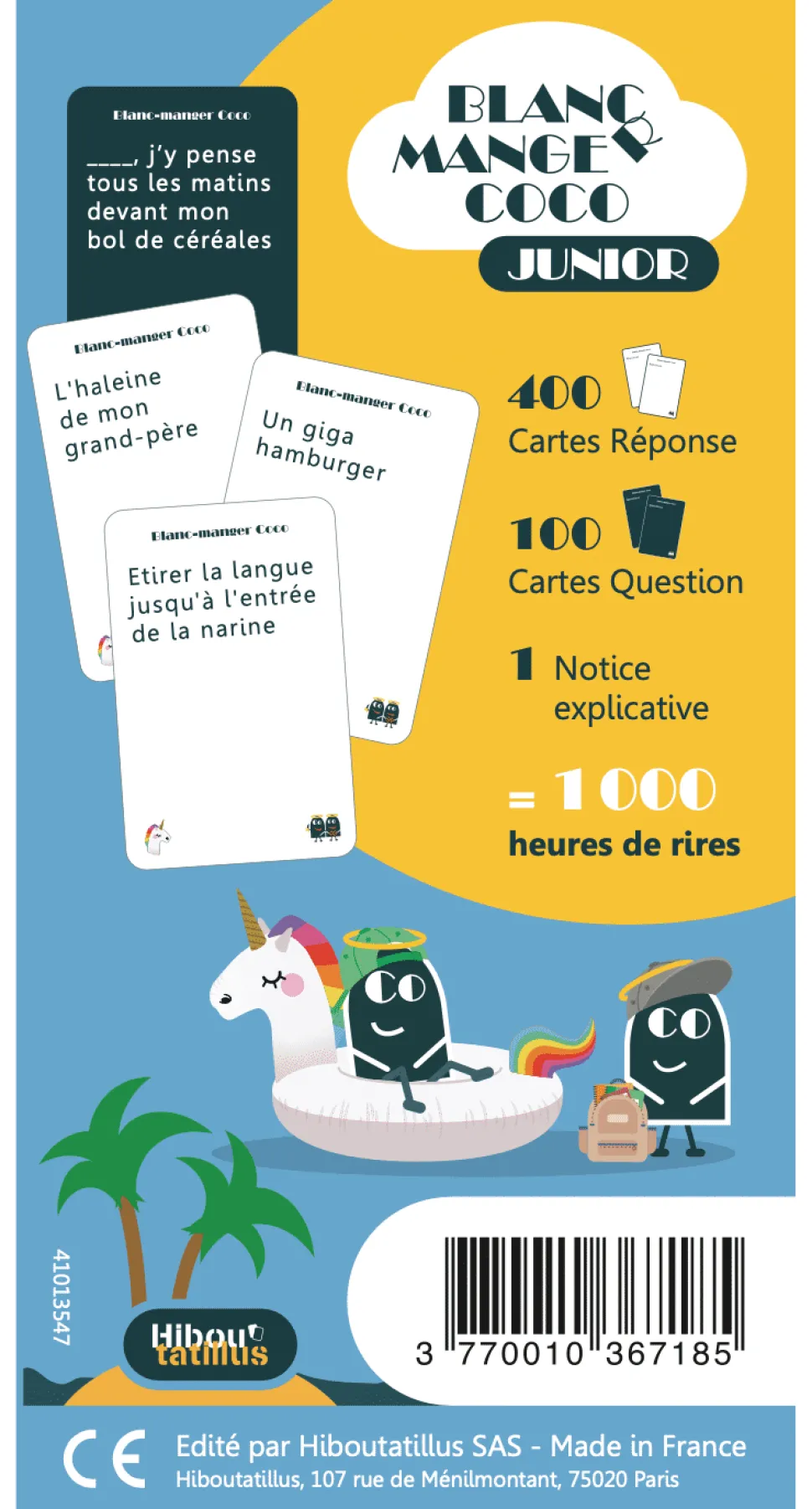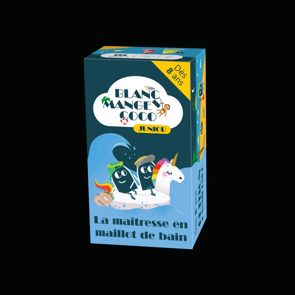 Dans Blanc-manger Coco Junior les joueurs créent des combinaisons hilarantes en comblant des phrases à trou. Ce jeu est la version adaptée aux enfants du jeu pour adultes Blanc-manger Coco La Maîtresse en Maillot de Bain est la version familiale de Blanc-manger Coco 100% adapté aux enfants dès 8 ans. Le jeu est destiné à jouer en famille ou uniquement par des enfants et fera rire aussi bien les petits comme les grands. Le but du jeu est de faire rire les autres joueurs avec des combinaisons de phrases à trous et de mots. Un joueur est désigné « question master » et lit une carte bleue avec une phrase à trou(s) tous les autre joueurs posent une carte blanche. Celui qui a posé la carte la plus drôle gagne la manche puis lit la carte bleue suivante et ainsi de suite Le premier joueur à 5 points est l’heureux vainqueur !