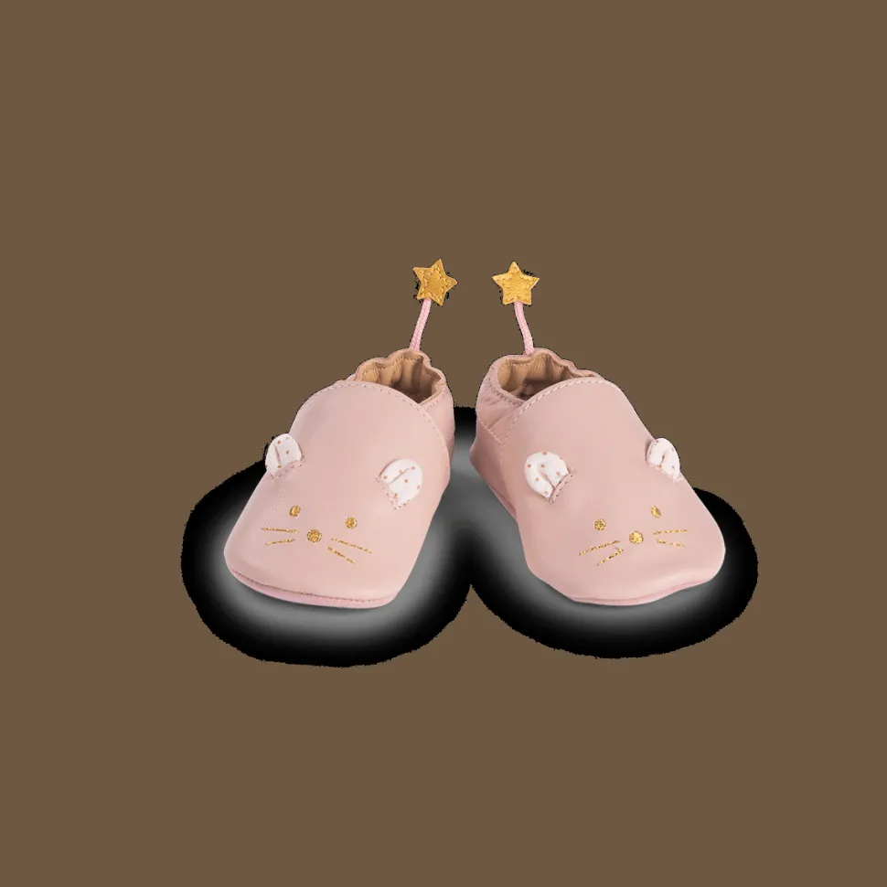 Chaussons en cuir 18/24m avec fermeture élastiquée, brodés d’une souris dorée avec ses oreilles à pois. Ils sont doublés, souples, avec une semelle en cuir velours antidérapante et une semelle intérieure amovible avec mousse, pour le confort de bébé !