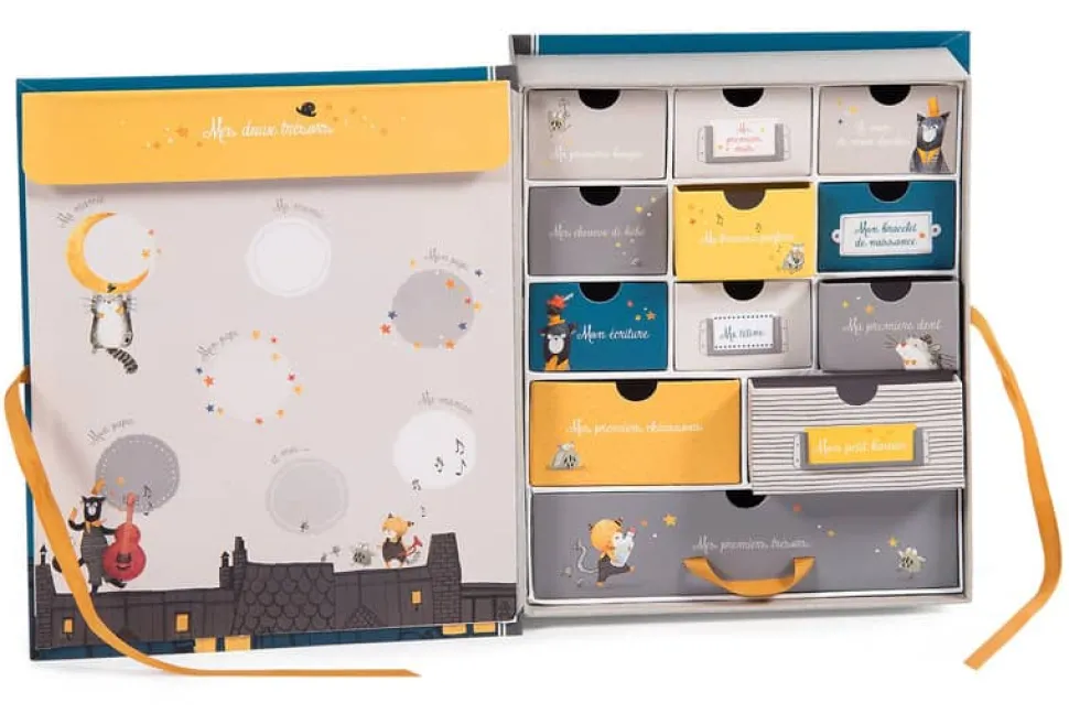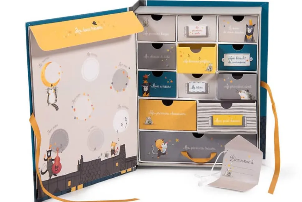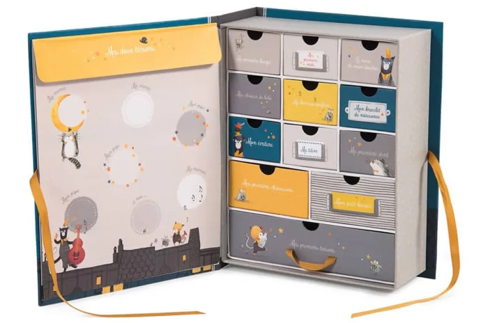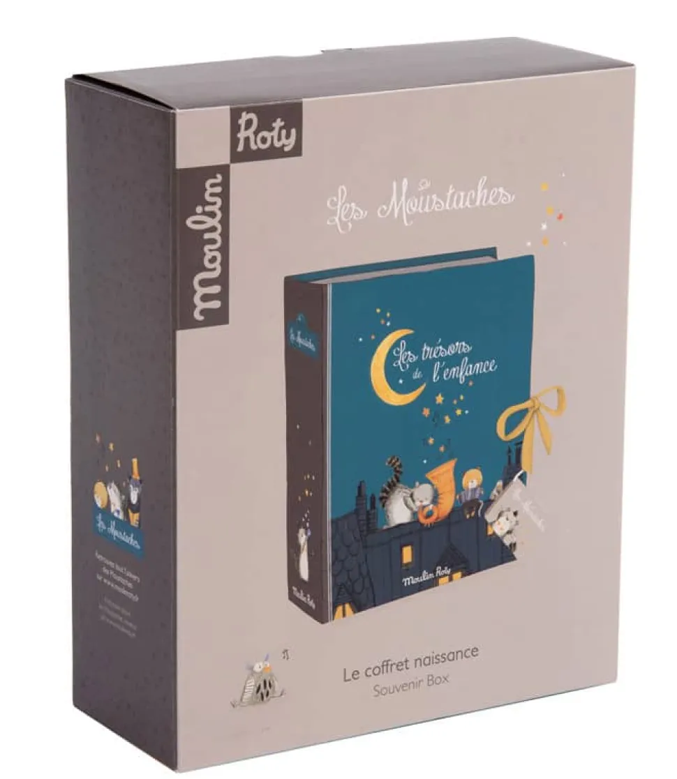 Découvrez l’univers chaleureux et délicat des Moustaches . Ce joli coffret de naissance bleu nuit illustré de chats musiciens s’ouvre comme un livre grâce au petit lien en ruban situé sur le côté. Sur la page de gauche se trouvent un arbre généalogique à compléter de photos de famille ainsi qu’une grande enveloppe pour conserver cartes de félicitations et le faire-part. Sur la page de droite se trouvent 12 tiroirs illustrés de félins moustachus qui attendent de recevoir les trésors de bébé, tels que sa première mèche de cheveux, sa tétine, ses premiers mots. Idéal pour un cadeau de naissance, il fera le plus beau des effets posé sur une commode ou sur une étagère tout en décorant la chambre de bébé avec tendresse. Il possède une petite cardonnette en forme d’enveloppe pour y écrire le nom du nouveau né. Tous les souvenirs de l’enfance de votre bout de chou seront conservés précieusement pour les lui montrer quand il sera plus grand. Nouveau . Il est désormais possible de personnaliser ce produit à l’aide d’un sticker au prénom de l’enfant . Appliqué lettre par lettre et à la main par nos soins, ce sticker fera le plus bel effet auprès de l’enfant et des parents tout en rendant ce cadeau unique. Dès 3 ans.
