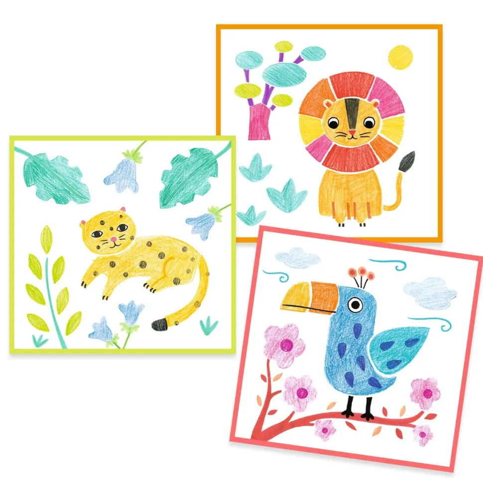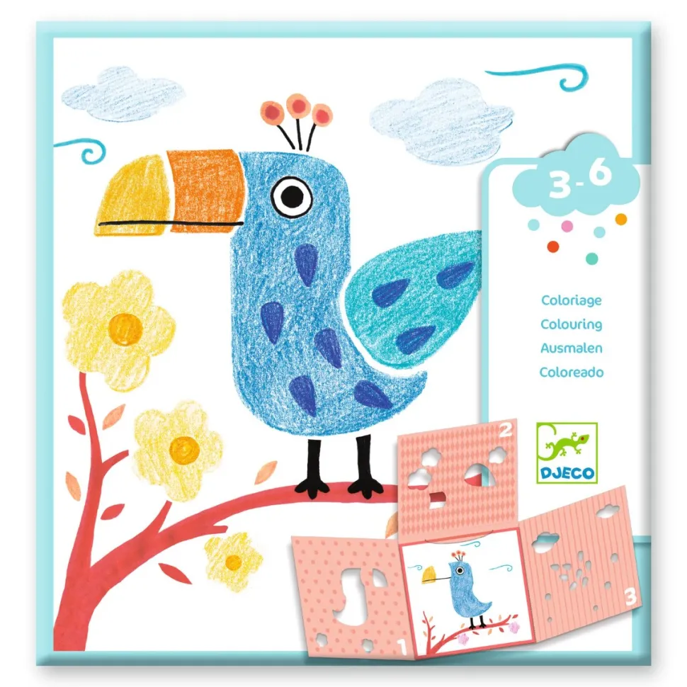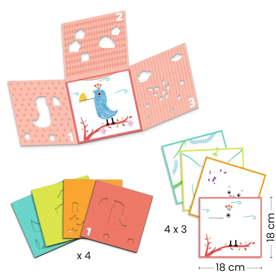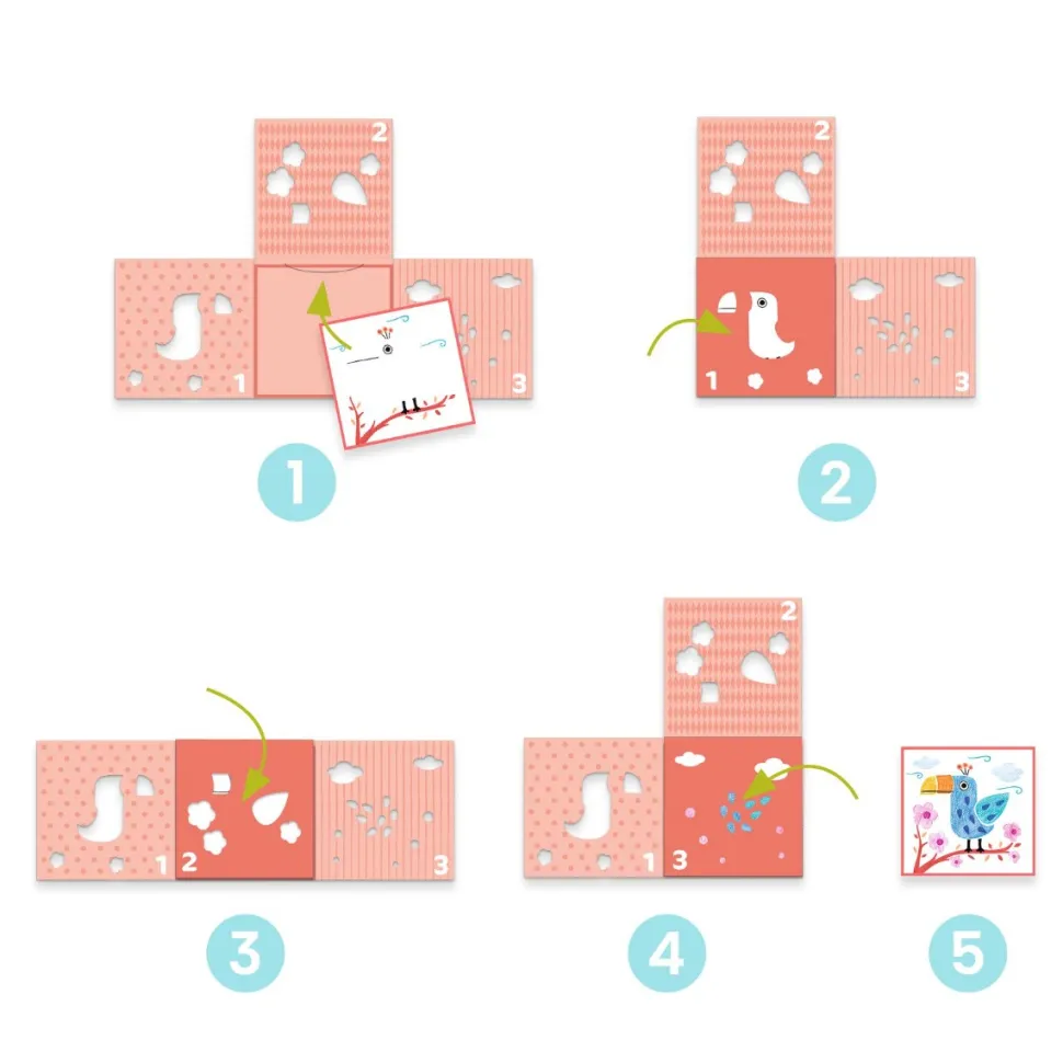 L’enfant crée son tableau à l’aide d’un seul pochoir découpé en 3. Il glisse une feuille, puis rabat le premier pochoir. Il colorie. Il ouvre et fait pareil avec le deuxième, puis le troisième. Le résultat : une magnifique œuvre d’art !