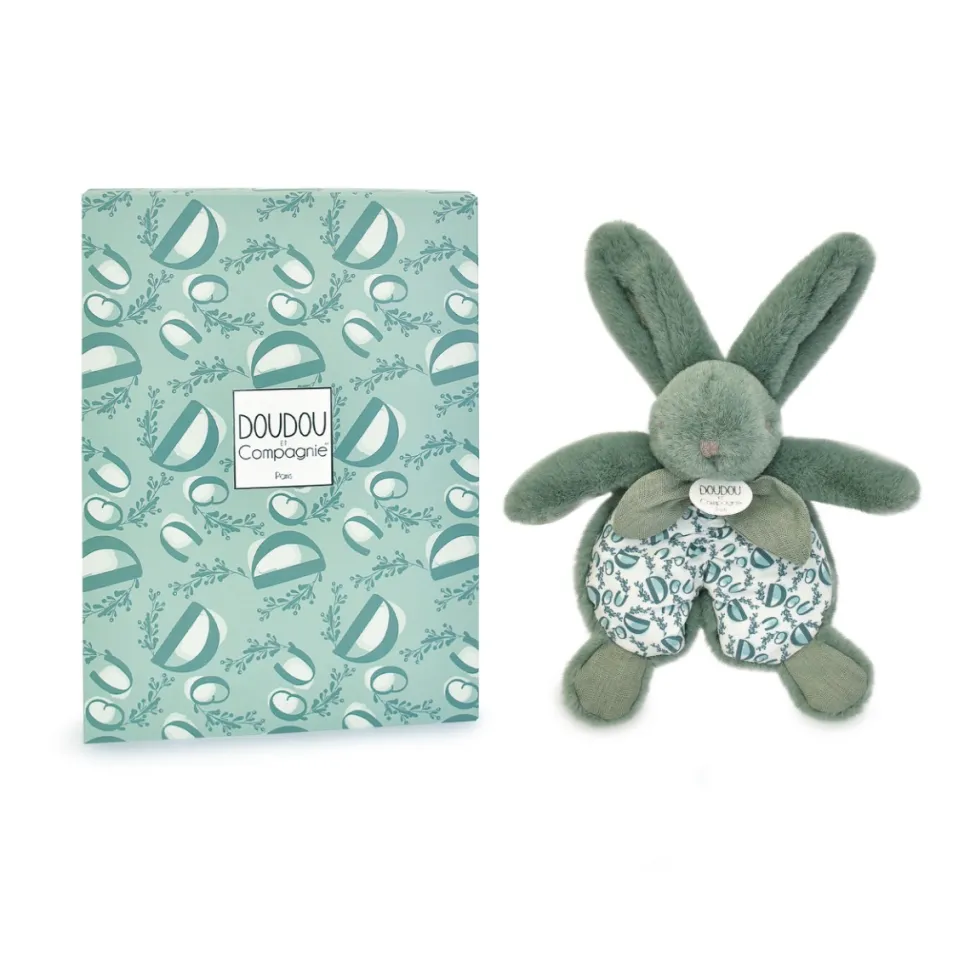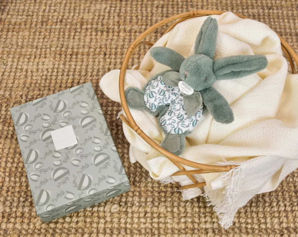 Au clair de la lune, MON AMI DOUDOU…un lapin habillé d’un foulard en lin, reflettant le chic à la française ! De couleur vert sauge, d’une forme originale grâce à son tissu froncé, il a des bras généreux pour se faire câliner. Son gonflant, son poil soyeux invitent à le serrer contre soi ou profiter simplement de sa présence, de jour comme de nuit. On retrouve également la matière lin sur ses pattes légèrement rembourées, très agréable toucher ! Son imprimé exclusif très frais est porteur d’un mot magique : DOUDOU ! UN DOUDOU à la dimension tactile incroyable !