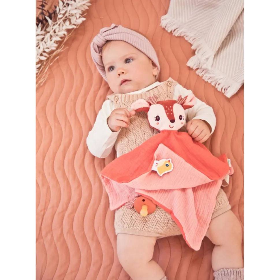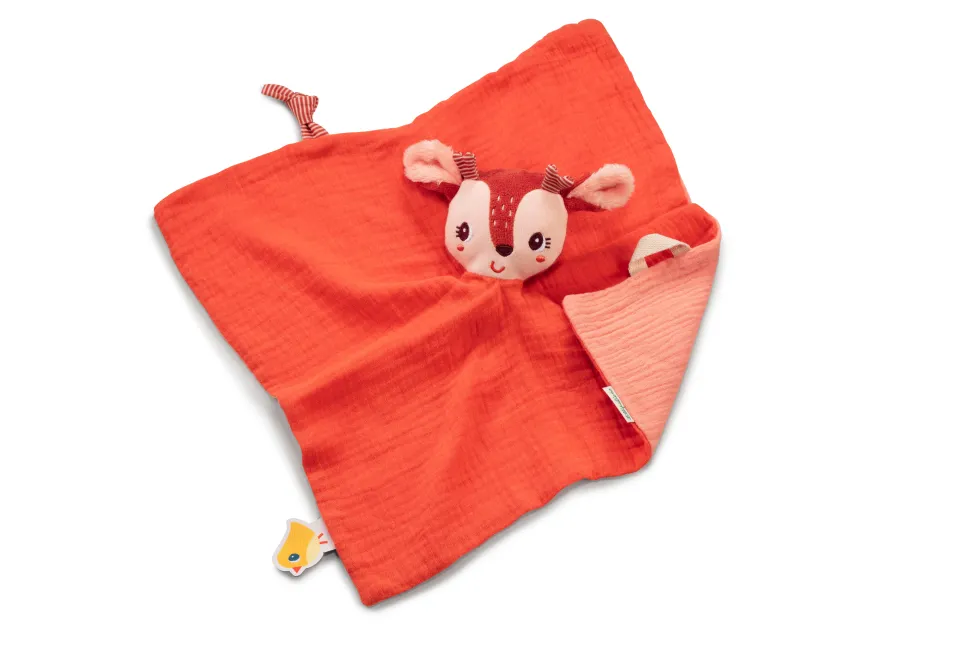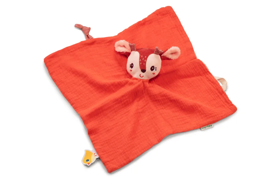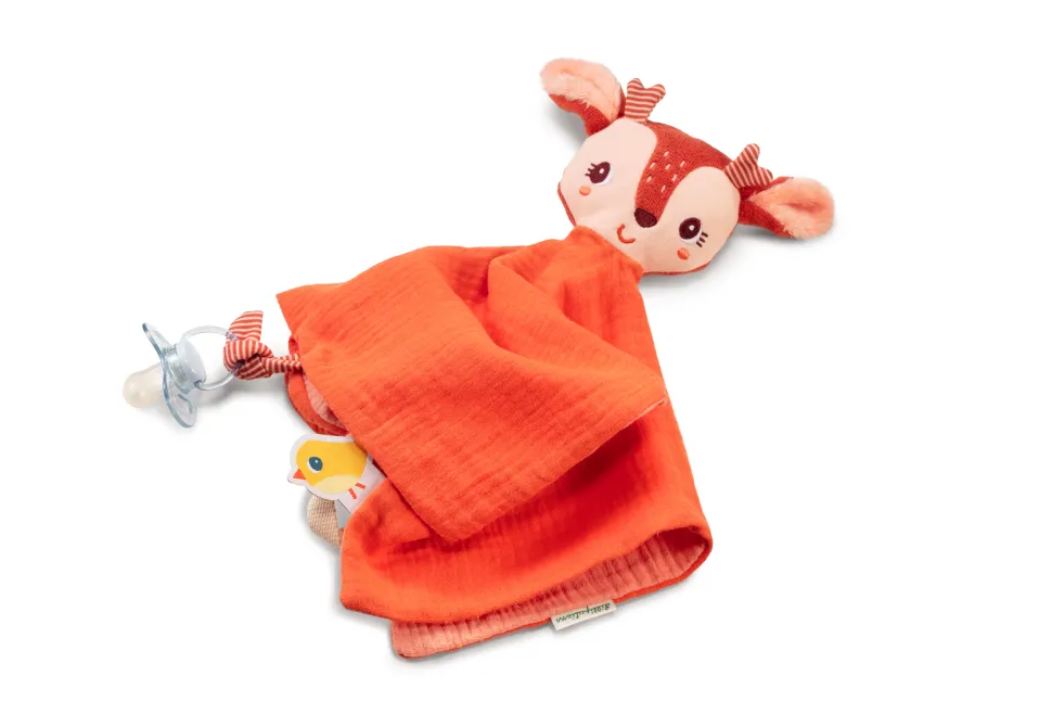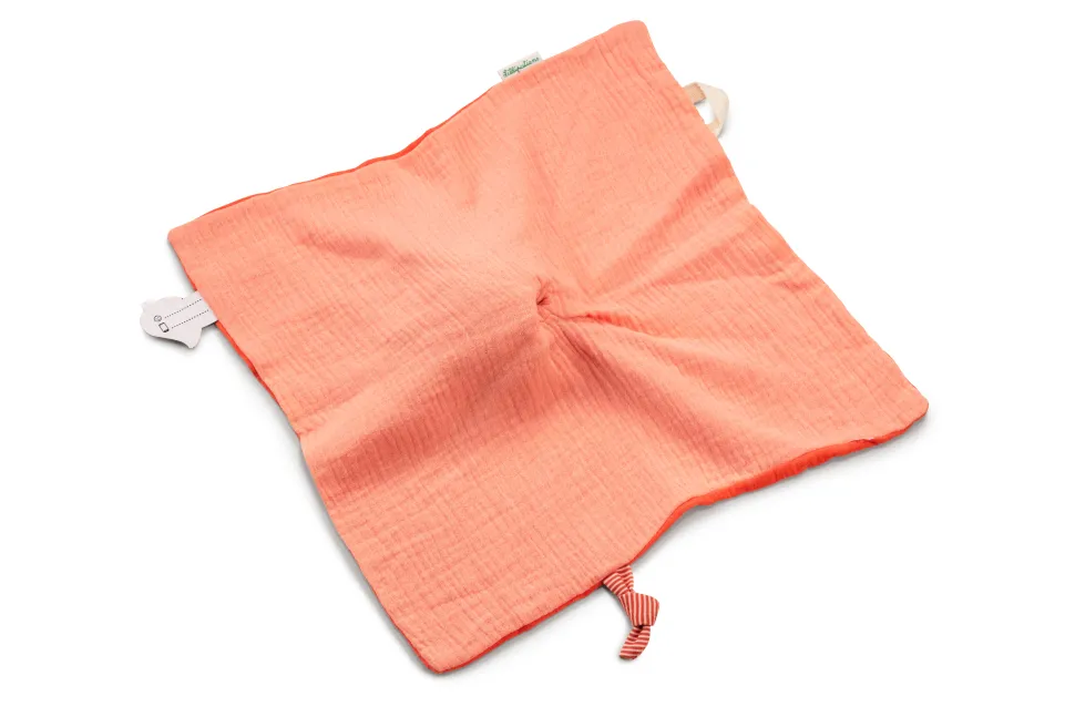 Ce doudou en coton organique offre du réconfort aux plus petits. La petite tête est une marionnette à doigts et le petit bouton permet d’attacher la tétine.