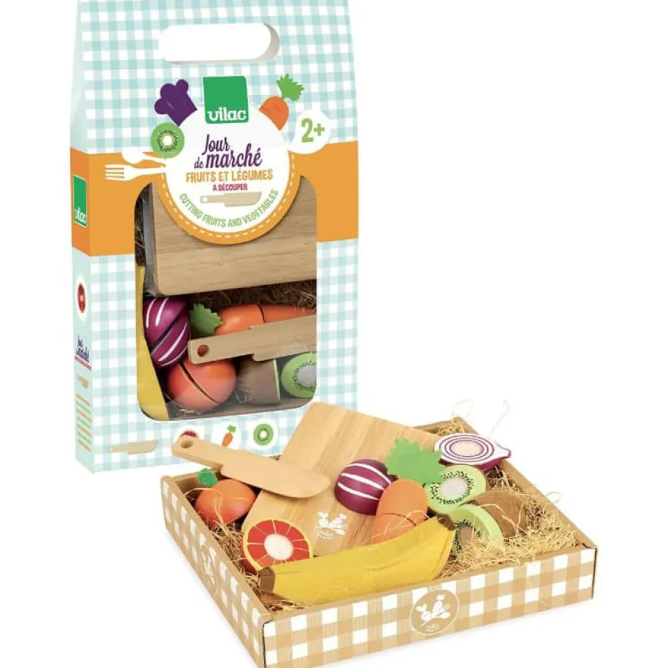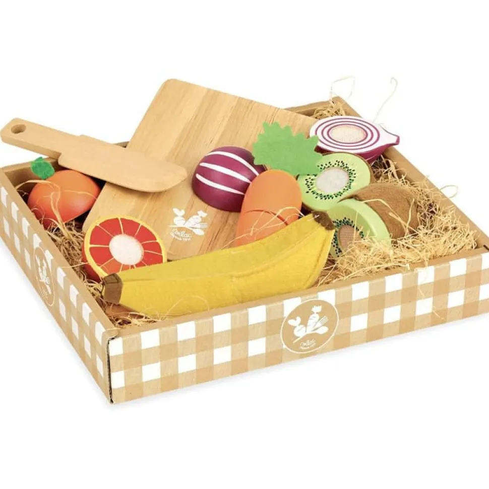 Un panier de 5 fruits et légumes en bois à découper, livré avec une planche à découper et son couteau. A partir de 2 ans.