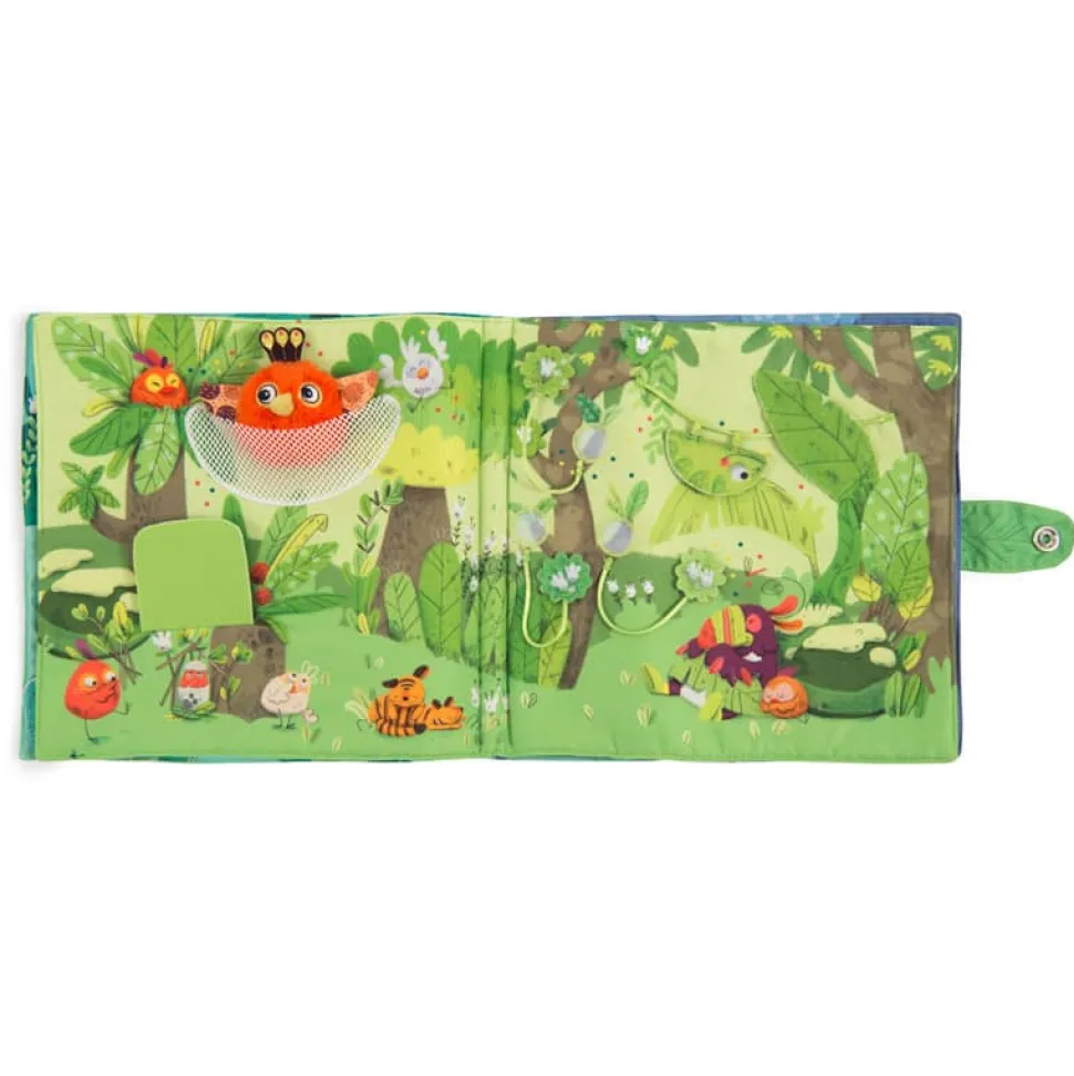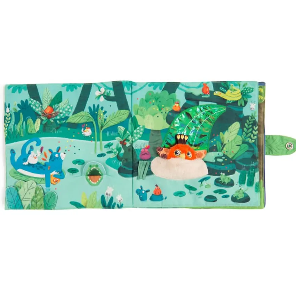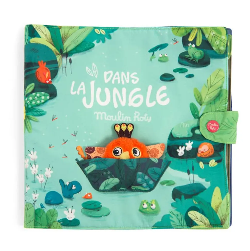 Livre en tissu 6 pages avec un petit poussin chantant à accompagner dans toutes les activités de la jungle ! Jeux de matières à découvrir et éléments à scratcher, il est idéal pour développer la motricité fine de bébé.