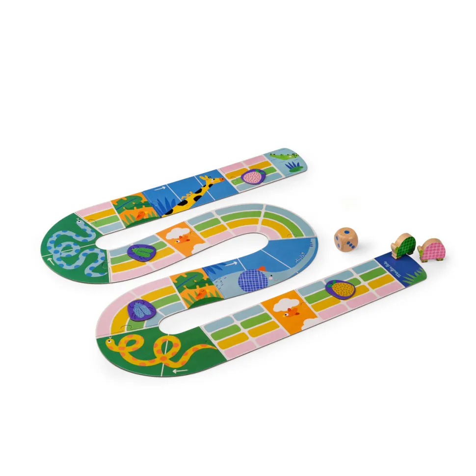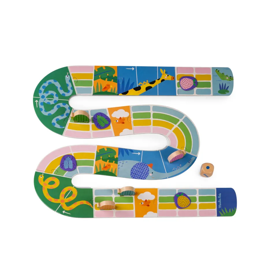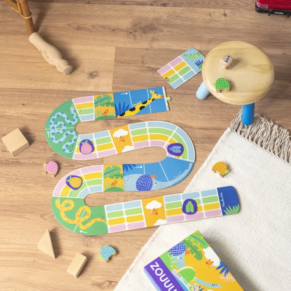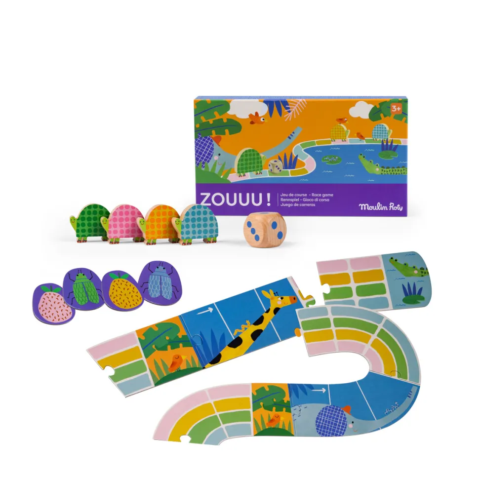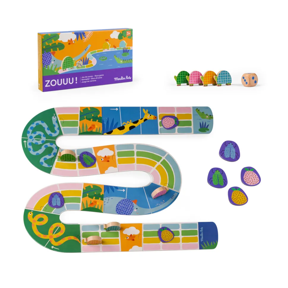 Zouuu, il fait chaud, tous à la mare ! Jeu de course, issu de la collection Les Toupitis. Soyez la première tortue à atteindre la mare pour se baigner avec le crocodile. Mais attention aux jetons pièges sur votre chemin ! De2 à 4 joueurs. 3 ans et +.