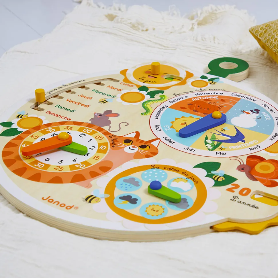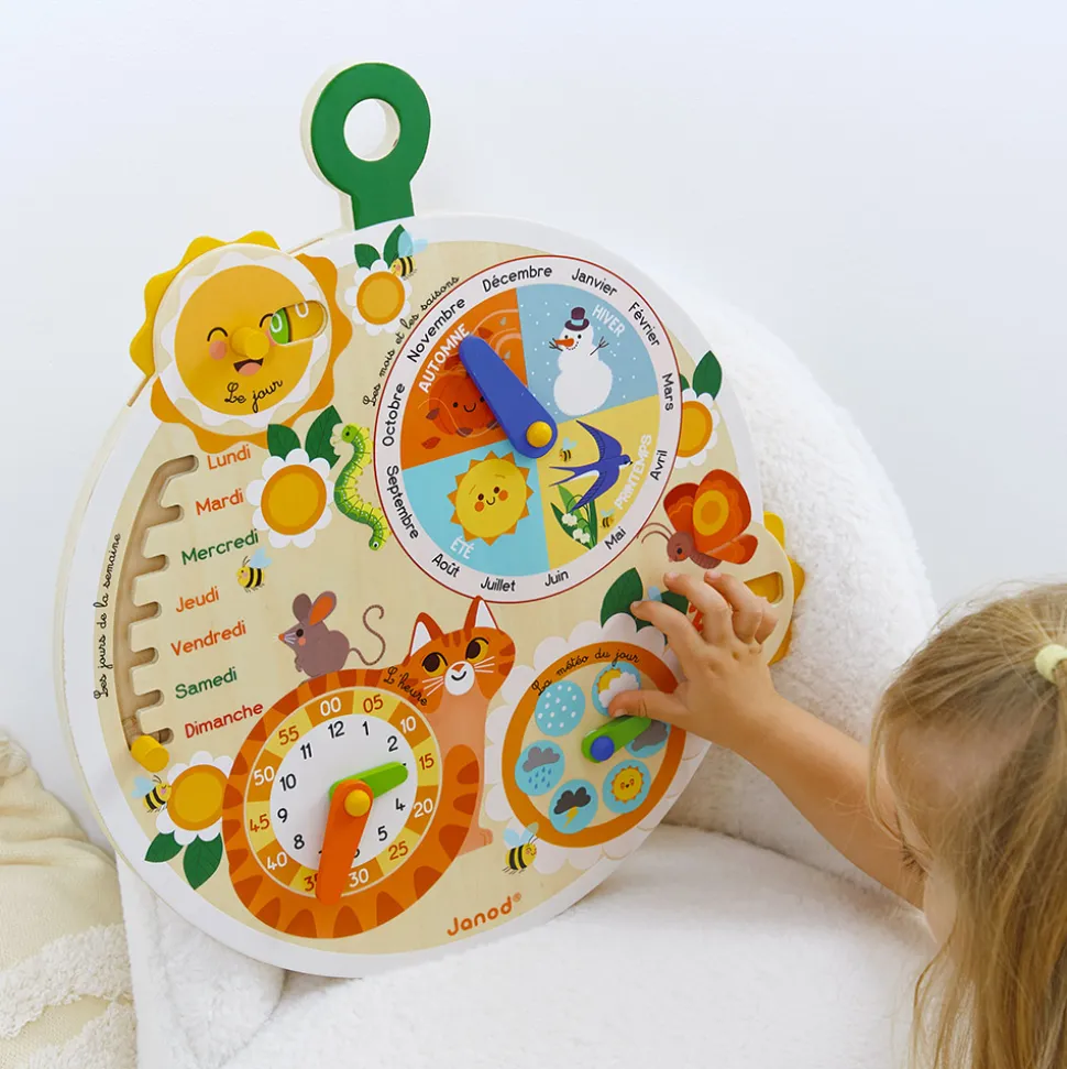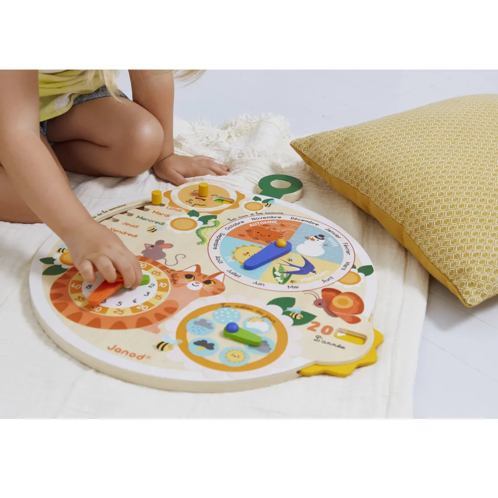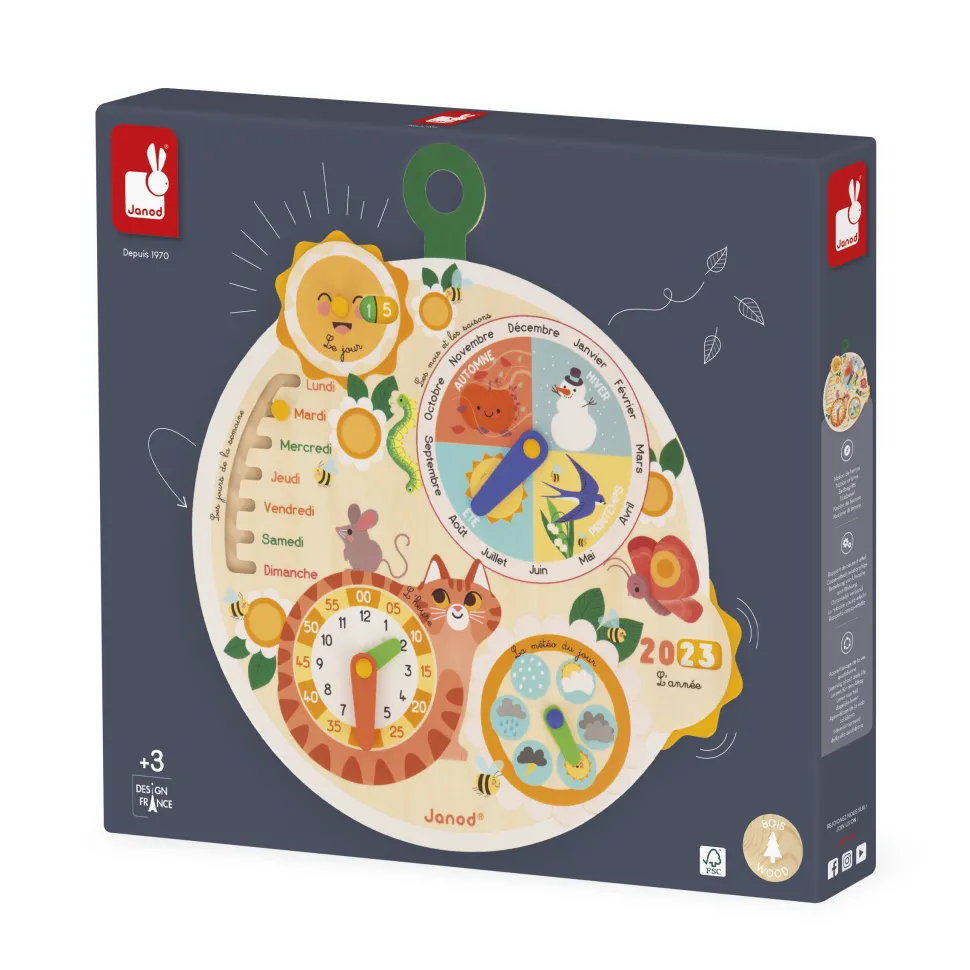 TIC…TAC, le temps est une notion difficile à apprendre. Grâce à ce jouet, votre enfant va apprendre à se repérer dans le temps tout seul et à son rythme. Un soleil tourne pour indiquer la date, un curseur permet d’apprendre les jours de la semaine, une horloge avec 2 aiguilles de couleur permet de différencier les heures et les minutes, un cadran météo pour que votre enfant apprenne à s’habiller seul, et enfin un cadran pour comprendre les saisons et les mois. Cette roue du temps comporte également une petite roue pour faire défiler les années (valable 10 ans, 5 ans sur une face, 5 ans sur l’autre). La roue peut être accrochée au mur. Jouet d’éveil en bois pour les enfants à partir de 3 ans. Jouet en bois FSC.