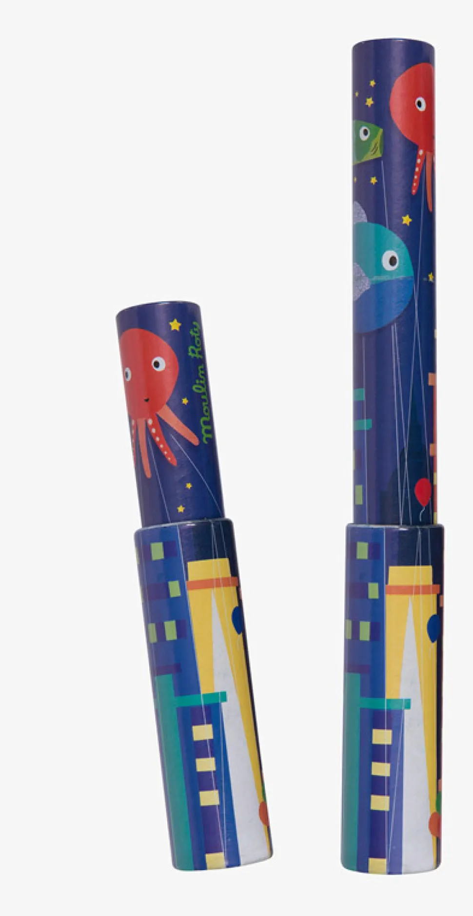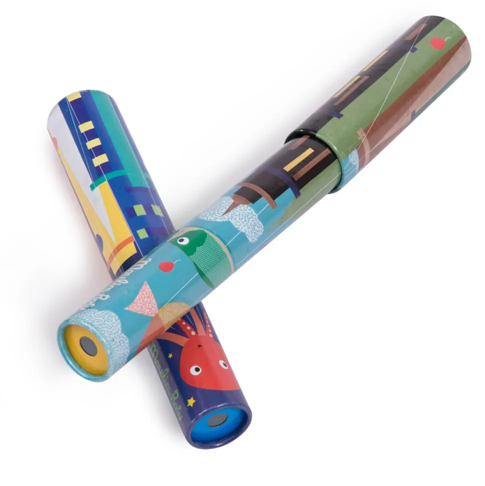 Kaléidoscope en carton Moulin Roty, illustré d’un décor de la ville en pleine nuit. Tourner, en même temps et à contre-sens, les deux parties de ce kaléidoscope pour découvrir toujours plus de nouvelles combinaisons de couleurs. !