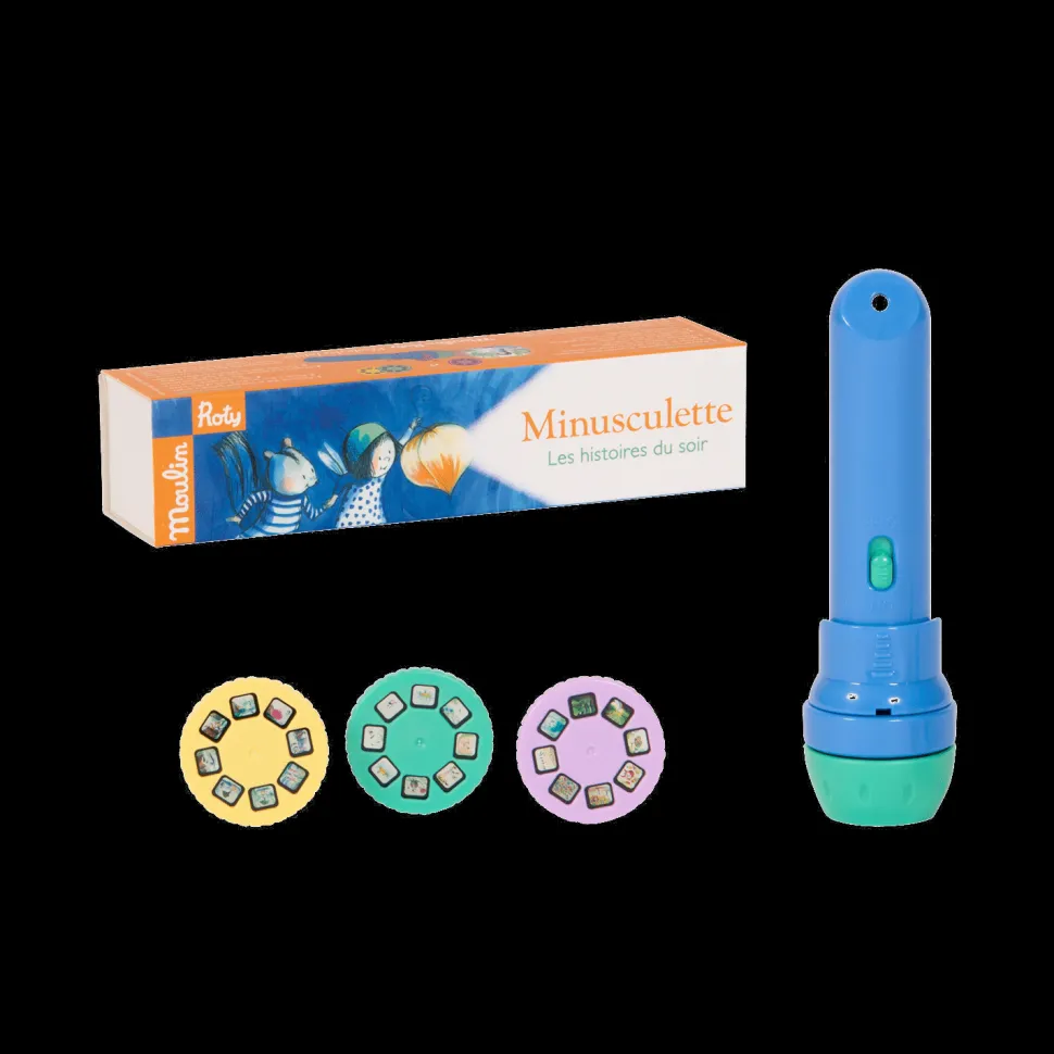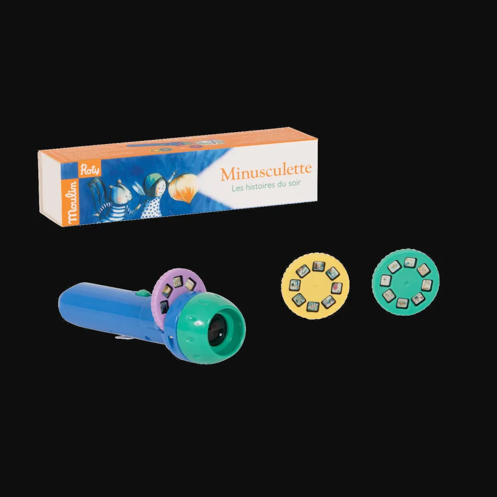 Lampe torche de poche où chacun des 3 disques projetés sur le mur raconte les aventures de Minusculette, une petite héroïne féérique de l’école des loisirs. Pour endormir les tout-petits et développer leur imagination !3 disques inclus