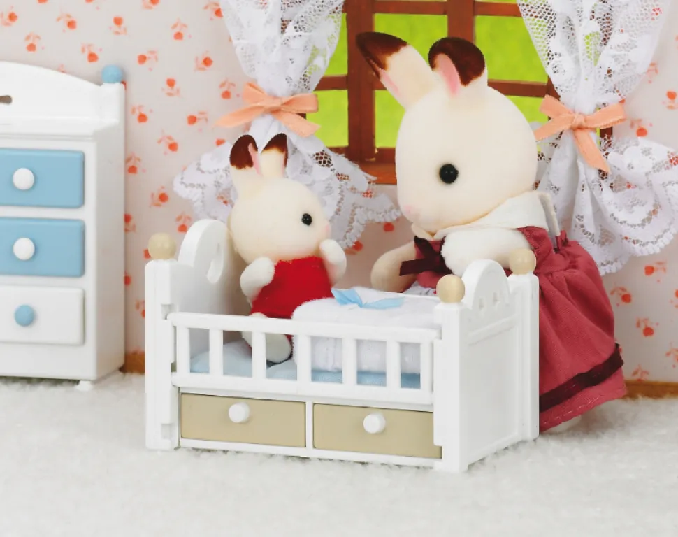 Un des indispensables de la maison des Sylvanian : le lit de bébé.Pratique, la barrière est amovible et il est muni de 2 tiroirs qui s’ouvrent et se ferment à loisir.Ce set comprend le lit et la figurine bébé lapin chocolat, 1 couverture, 1 oreiller en forme de lapin et 1 peluche pour bébé.