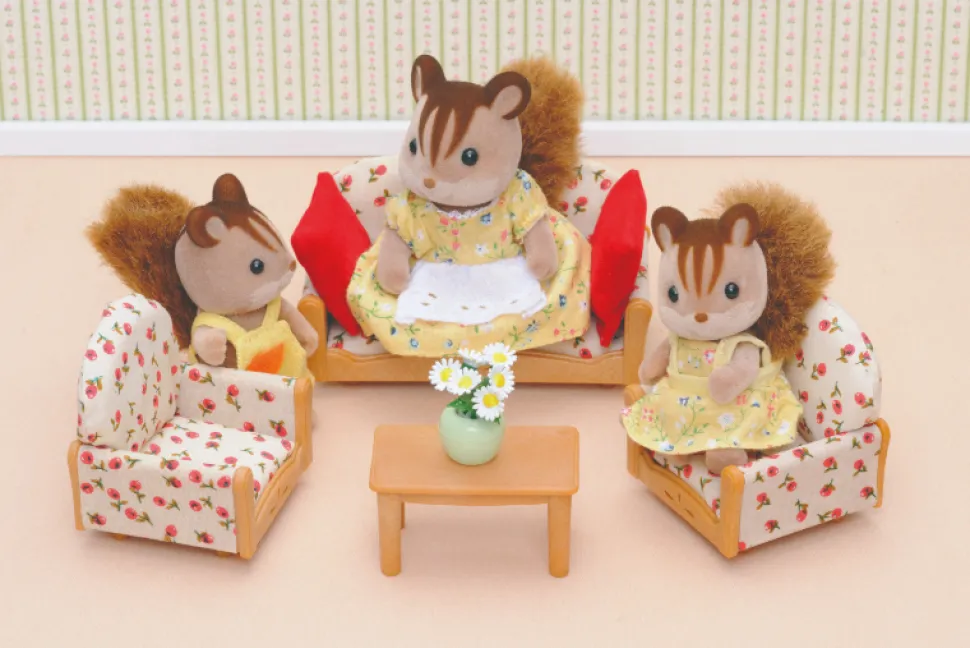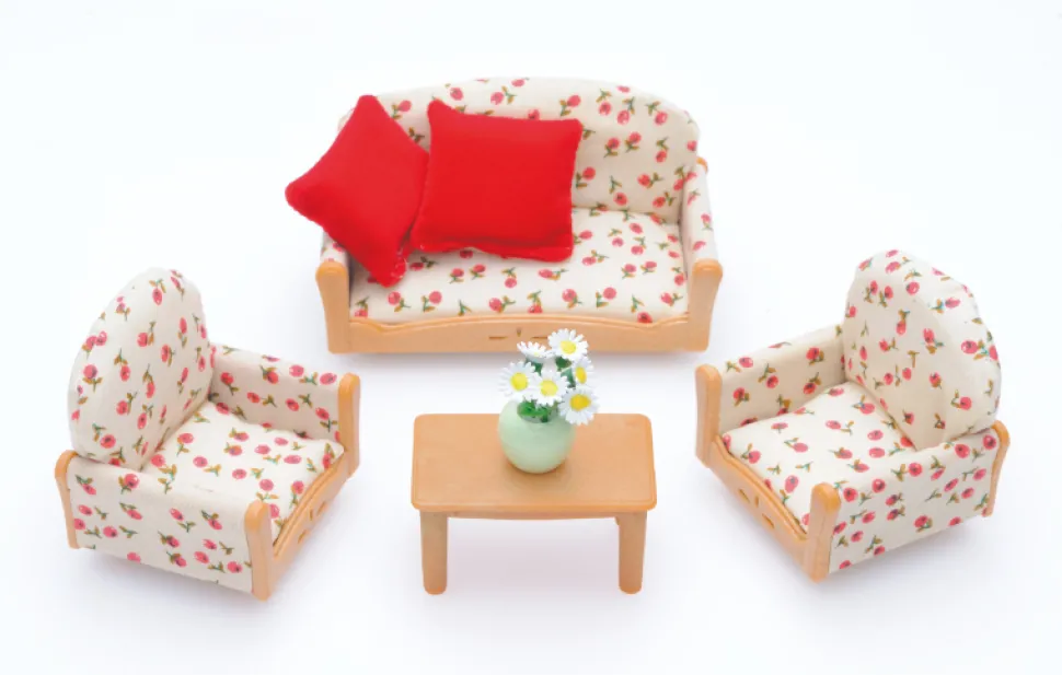 Ce set d’ameublement pour le salon comprend 1 canapé, 2 fauteuils, 1 table basse, 1 pot de fleurs, 2 coussins.