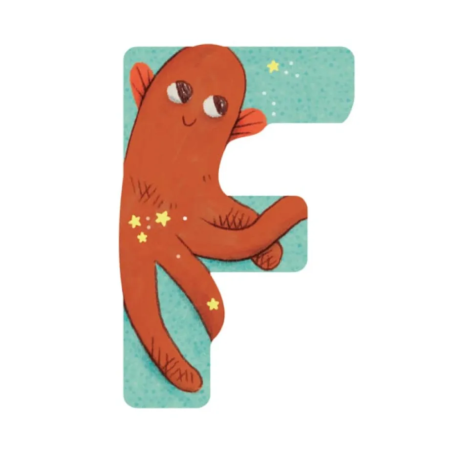 Lettre F en bois, illustrée avec un poulpe pour décorer la chambre de bébé ou composer un joli abécédaire. Lettre facile à prendre en main pour se familiariser avec l’alphabet.