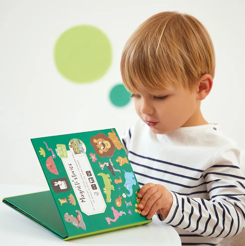 Partez à la découverte des animaux d’Afrique ! Lion, éléphant, singe, suricate et même piranha, sont tous présents et attendent votre enfant pour vivre de grandes aventures. Ce livre a tout le nécessaire pour créer des histoires à l’infini : un grand décor magnétique et 30 magnets représentant des animaux et quelques éléments de décor. Jouet magnétique en carton FSCTM. Jouet pour les enfants à partir de 3 ans.