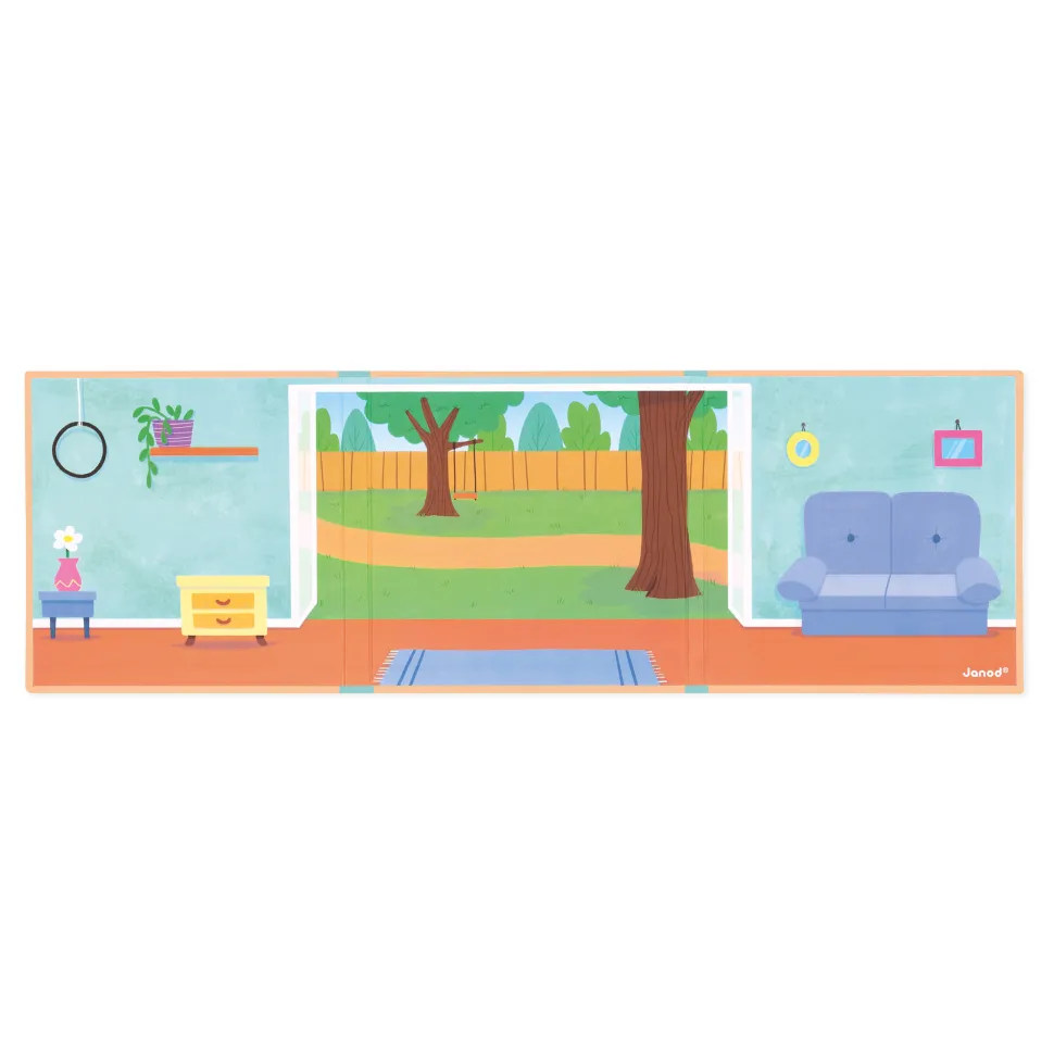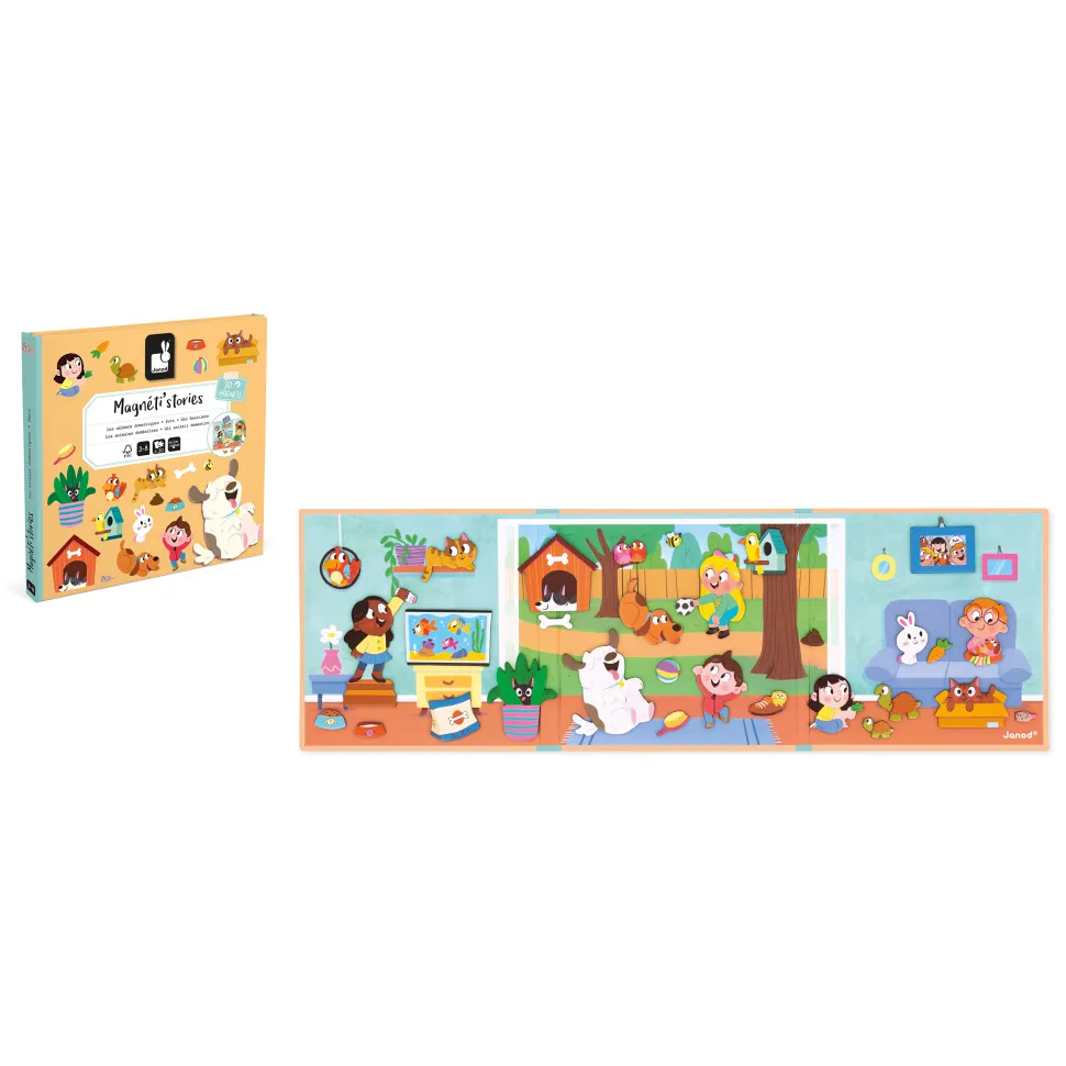 Bienvenue dans cette grande maison, remplie d’animaux dont il faut s’occuper et qui ne demandent qu’à jouer ! Il faut jouer au ballon avec le chien, nourrir les poissons, et ne pas perdre de vue le hamster qui adore se cacher dans les chaussures ! Avec un grand décor magnétique et 30 magnets votre enfant a tout le nécessaire pour imaginer de grandes histoires. Jouet magnétique en carton FSCTM. Jouet pour les enfants à partir de 3 ans.