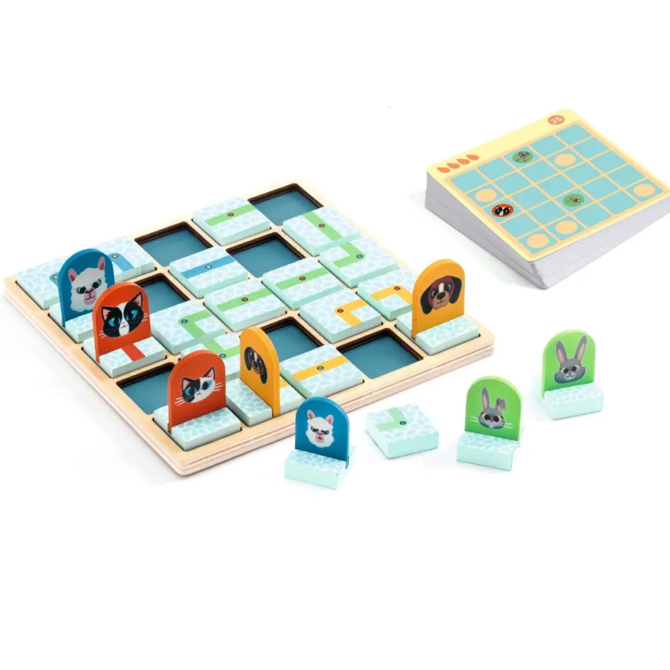Un jeu à la prise en main rapide et évidente. Les petits animaux sont perdus ! Il faut les aider à retrouver leur parent en leur créant l’unique chemin possible en plaçant des tuiles-chemin dans la grille en bois.