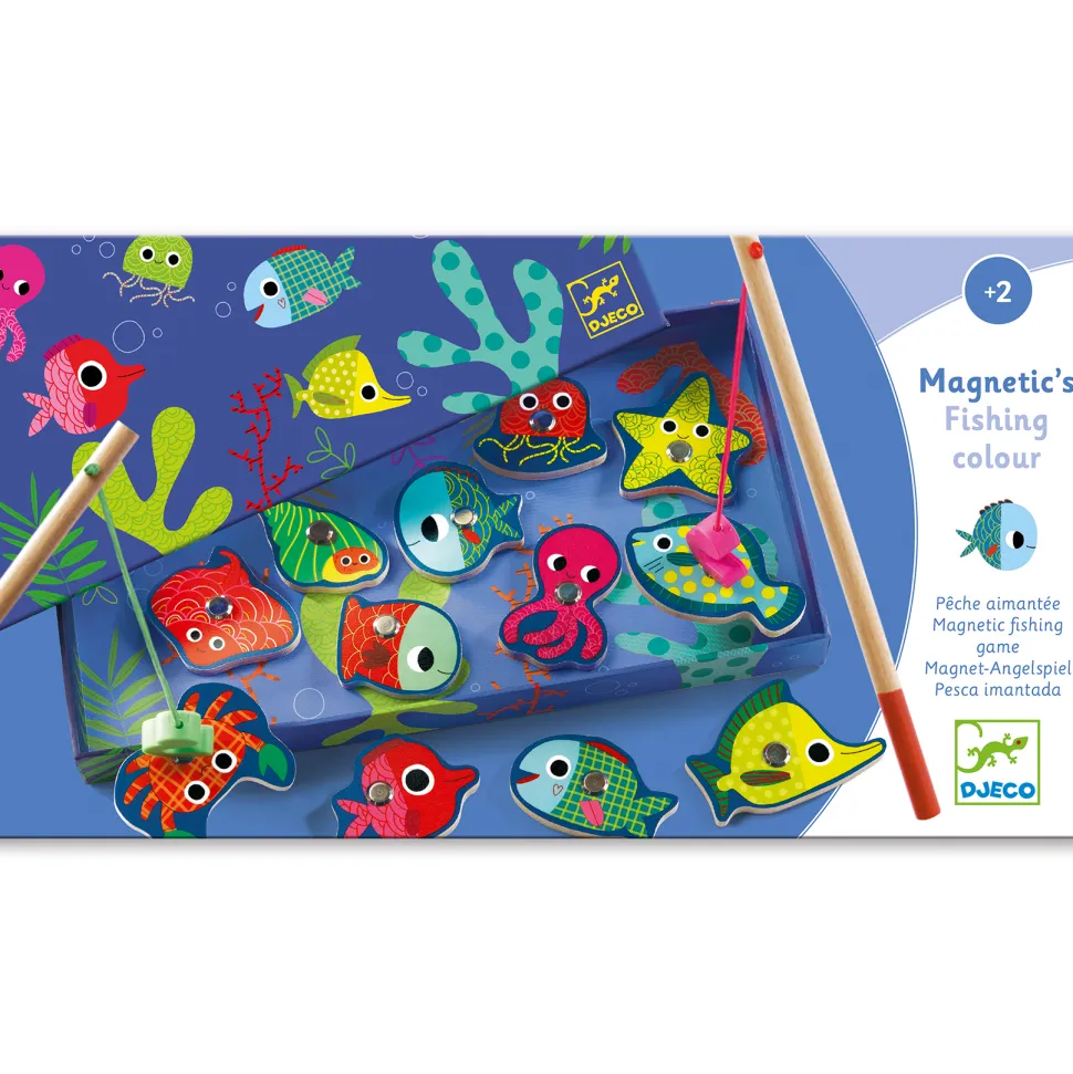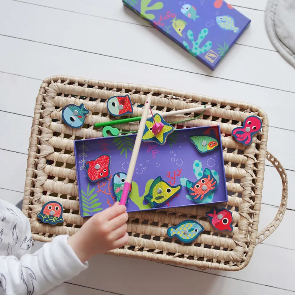 Prêts pour une partie de pêche ? Des animaux de la mer en bois, 2 cannes à pêche et une jolie boîte qui se transforme en fond marin. L’enfant attrape les pièces en bois aimantées à l’aide de la canne. La partie de pêche peut commencer ! Pour les petits pêcheurs à partir de 2 ans. Contenu : 12 pièces (bois et métal) et 2 cannes à pêche (bois, plastique, aimant), 1 boîte décorative.