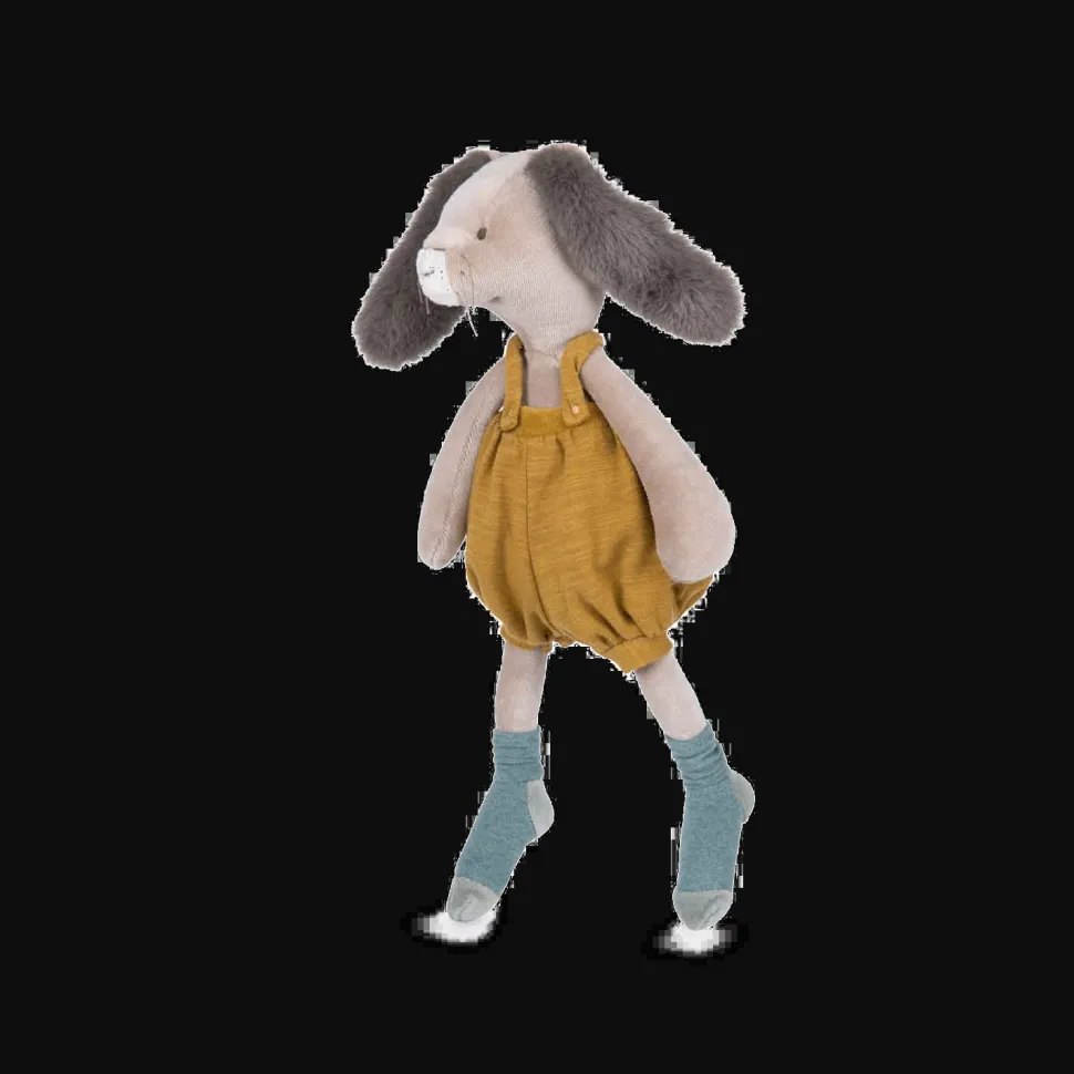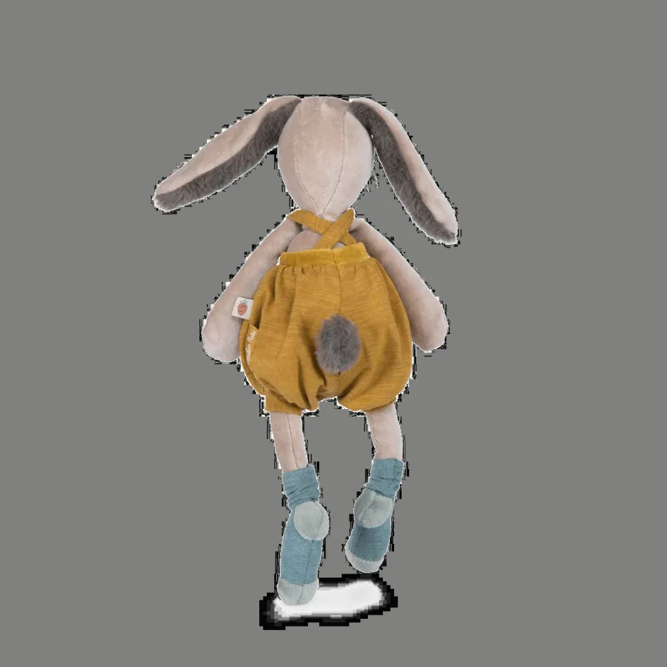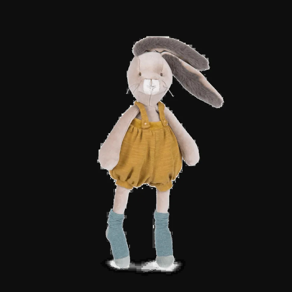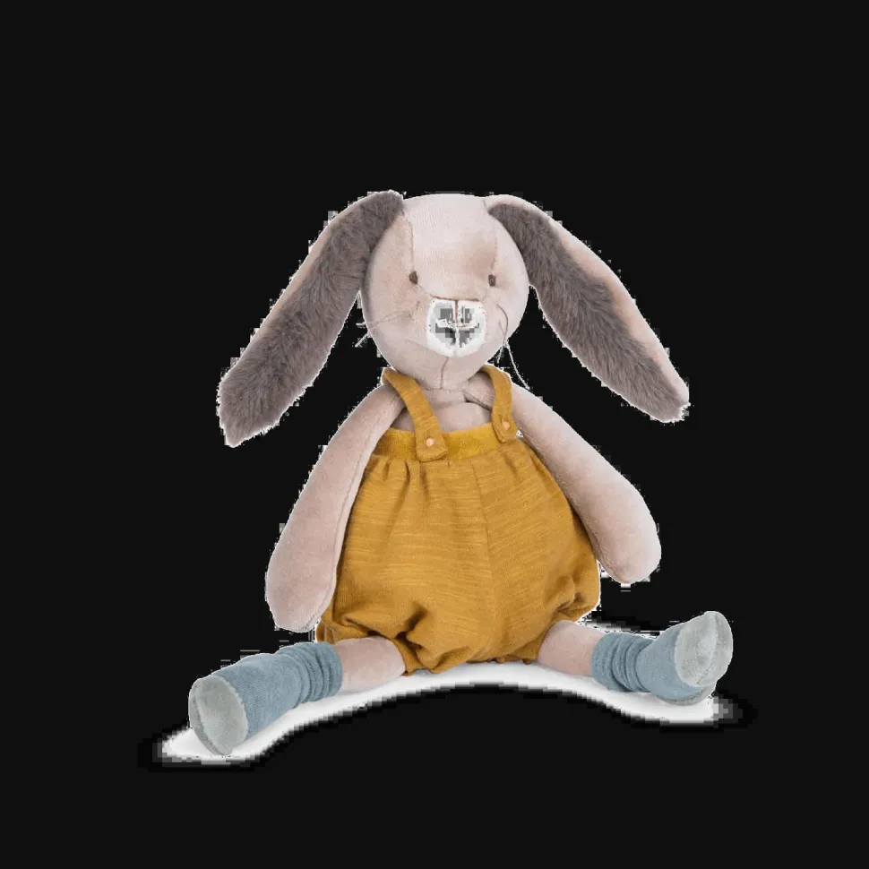 Avec sa frimousse à moustaches et ses grandes oreilles toutes douces, cet adorable lapin à la salopette ocre ne demande qu’à faire des câlins ! Compagnon de jeu la journée et doudou protecteur la nuit, il accompagnera bébé dans toutes ses aventures.