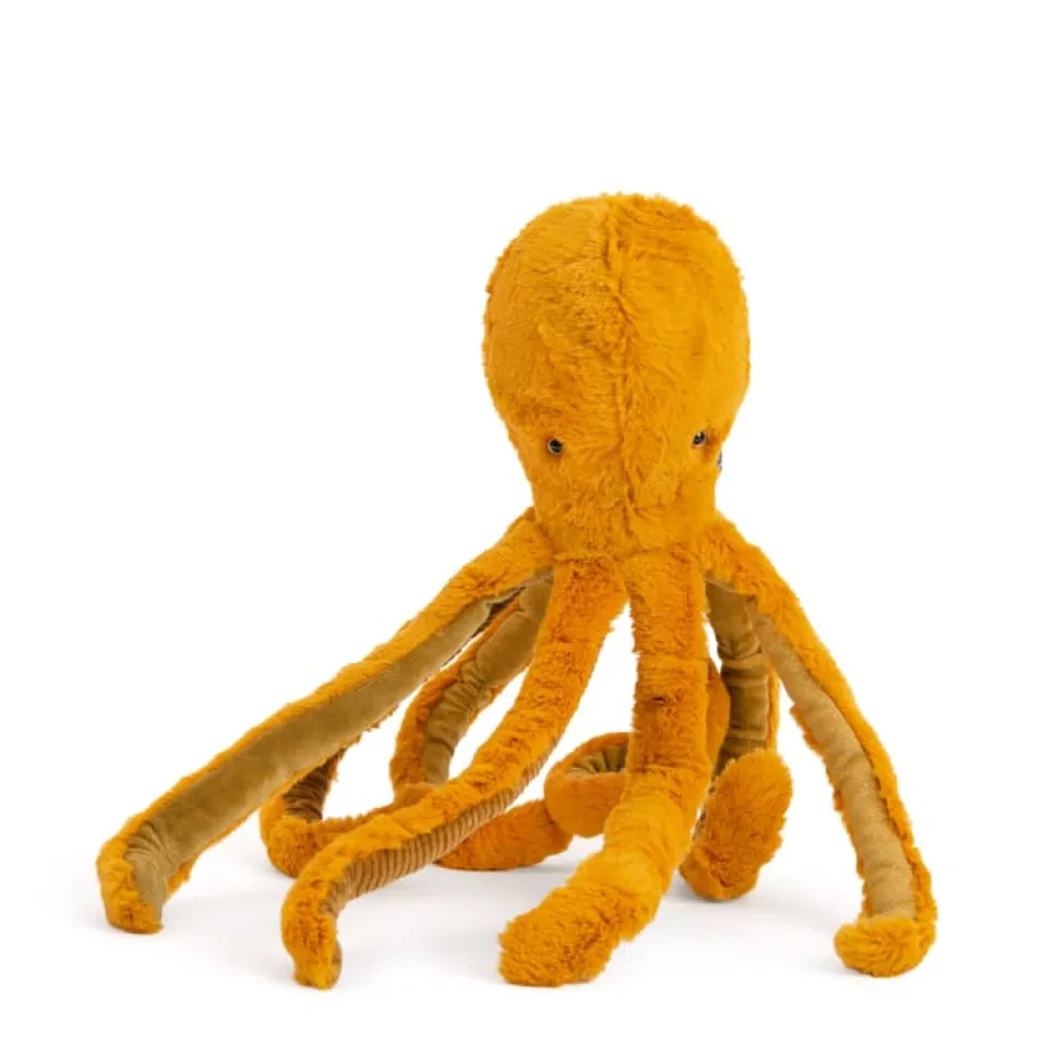 Petit poulpe a choisi sa couleur préférée : le doré ! Son corps tout en fourrure en est couvert, jusque sous ses tentacules pailletés ou en velours, qui rebondissent au rythme de ses mouvements… Suivez son regard bleu profond à travers l’océan…