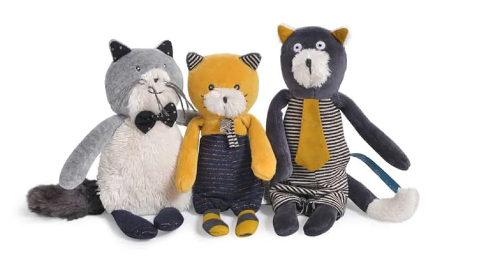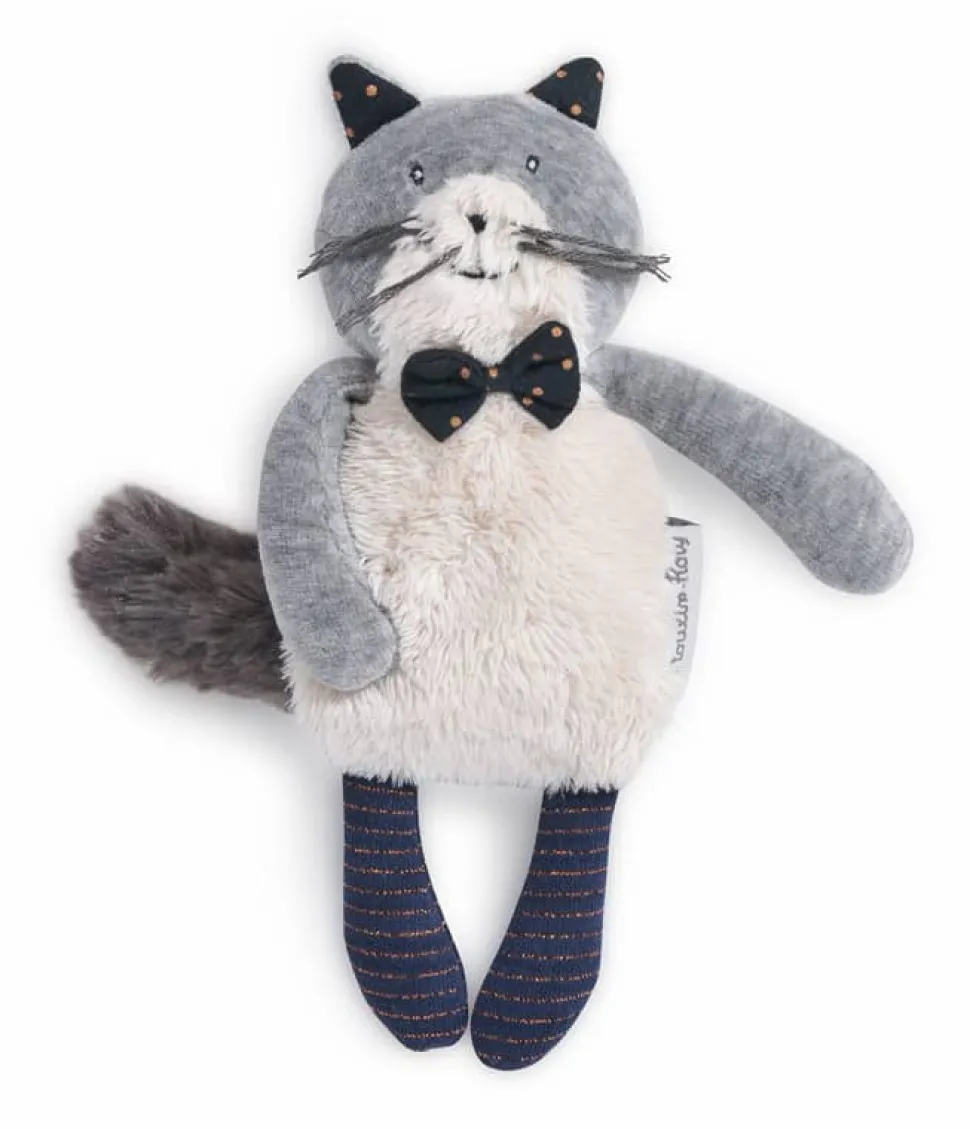 Cette petite peluche de 19 cm représente le chat des Moustaches Fernand. Ce matou chic porte un nœud papillon noir à pois cuivrés assorti à ses oreilles et des chaussettes rayées. Son pelage gris et son ventre en fourrure très douce en fera craquer plus d’un. Sa petite taille fait de lui un ami facile à manipuler par les petites mains de bébé. Un adorable cadeau pour accompagner votre enfant dès sa naissance.