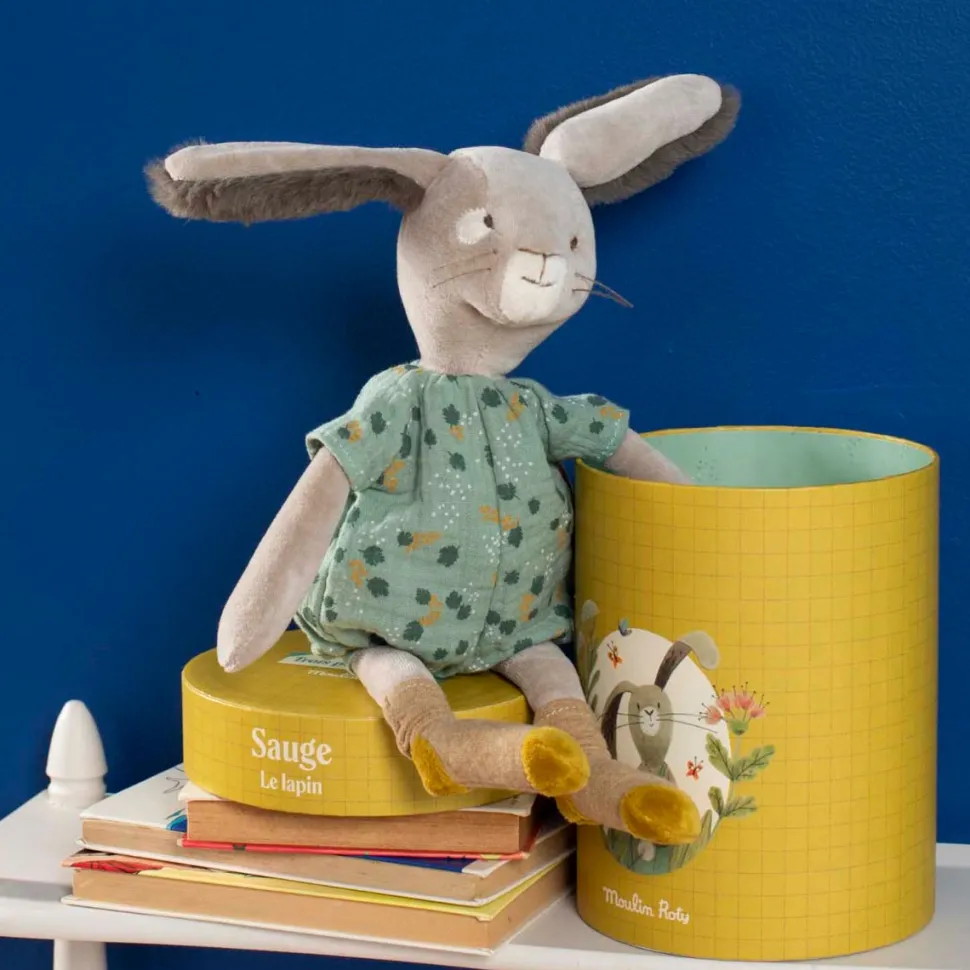 Poupée lapin sauge Trois petits lapins de Moulin Roty. Tendre petit lapin en velours et détails brodés, tout doux avec sa jolie tenue à motif sauge. Dans une jolie boîte toute en rondeur, il ne demande qu’à faire des câlins ! Idéal pour un cadeau de naissance.