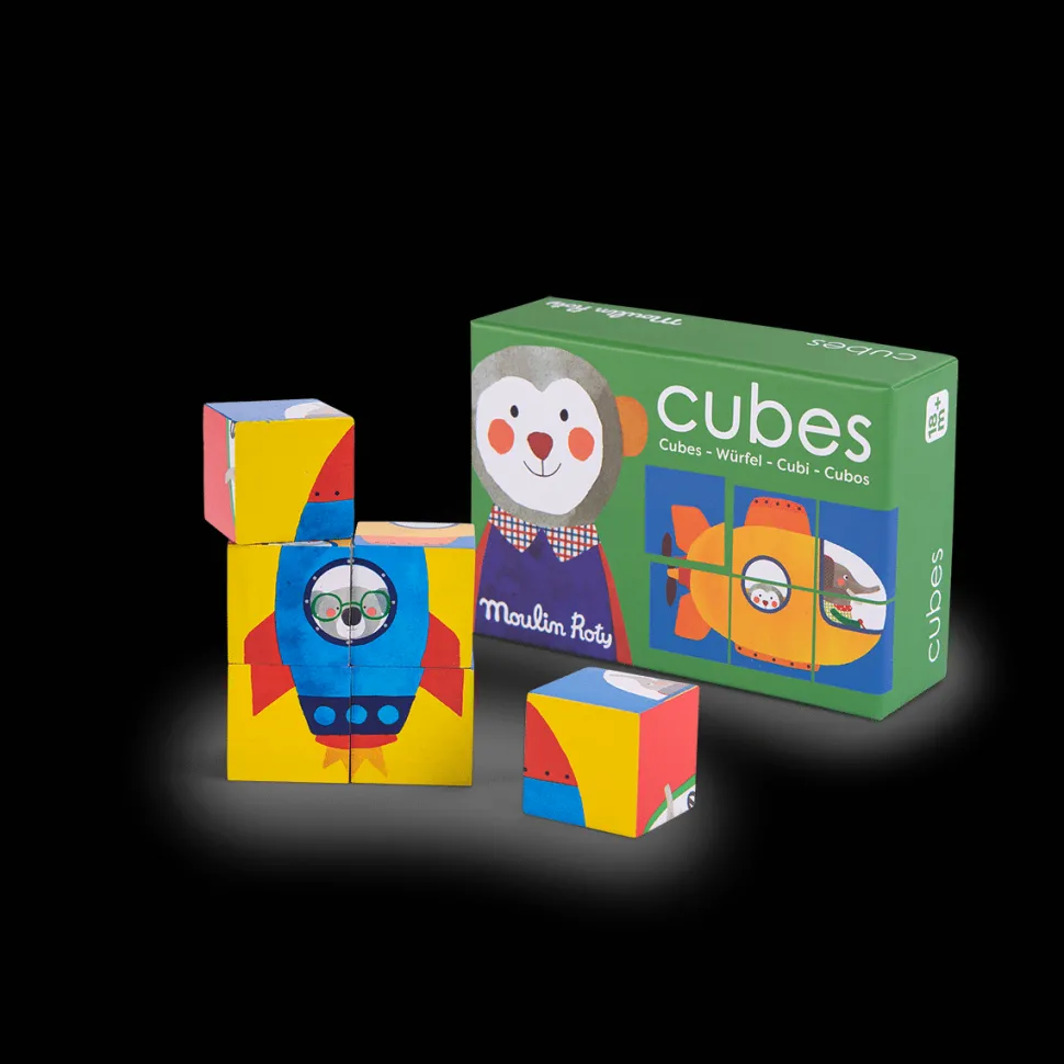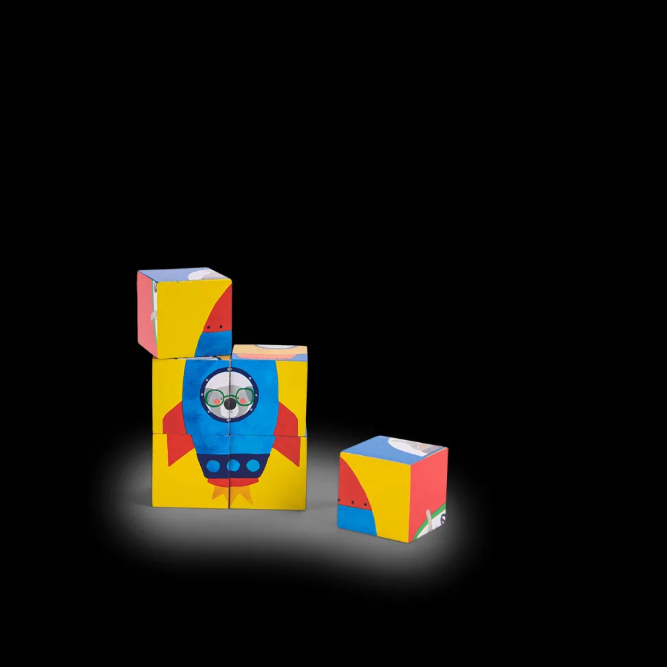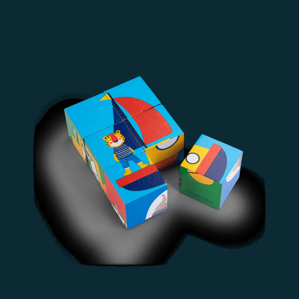 Jeu d’éveil 2 en 1 pour les tout-petits. à la fois puzzle et jeu de construction. Tourne les faces illustrées des 6 cubes pour reconstituer Les Popipop dans leur moyen de locomotion préféré. Cubes en bois facile à manier. Dès18 mois