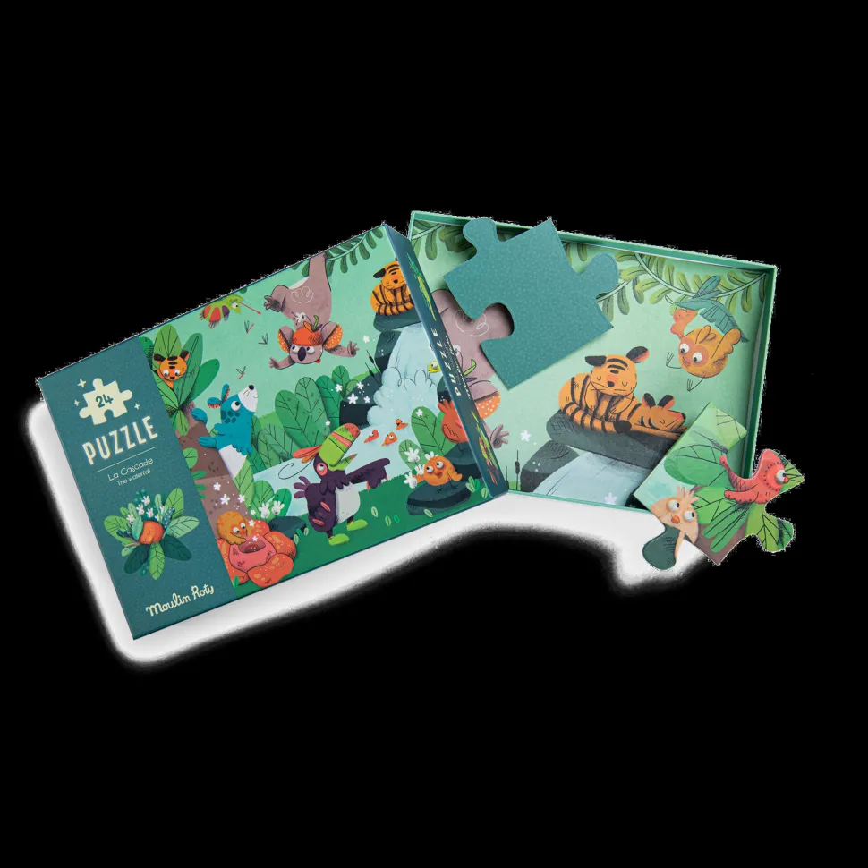 Rendez-vous à la cascade avec ce puzzle phosphorescent de 24 pièces issu de la collection Dans la Jungle ! Après l’avoir reconstitué, éteins la lumière afin que la magie opère. Contient 1 poster modèle pour aider l’enfant à le recomposer facilement.