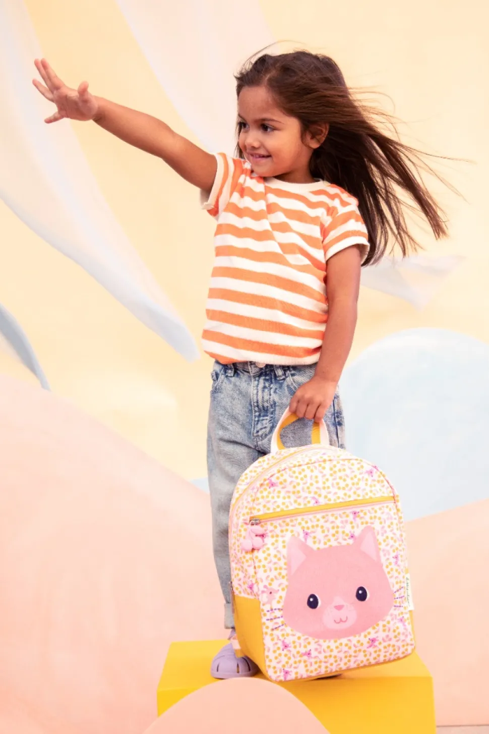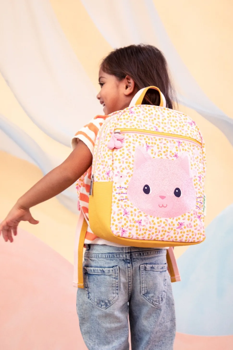 Jeanne le chat, éclatante et brillante, donne envie de l’emmener partout avec soi ! La grande poche à l’avant du sac permet de ranger plein d’objets à aller chercher facilement. Le sac à dos est fabriqué à partir de matériaux PET-recyclés de haute qualité et résistants à l’eau. À l’intérieur du sac à dos, il y a de l’espace pour noter les coordonnées du propriétaire, une sangle élastique pour maintenir la bouteille d’eau en place, et un compartiment de rangement. Les bretelles sont réglables, et la sangle de poitrine maintient le sac à dos fermement sur le dos de votre enfant. Idéal pour les sorties, les loisirs ou l’école.