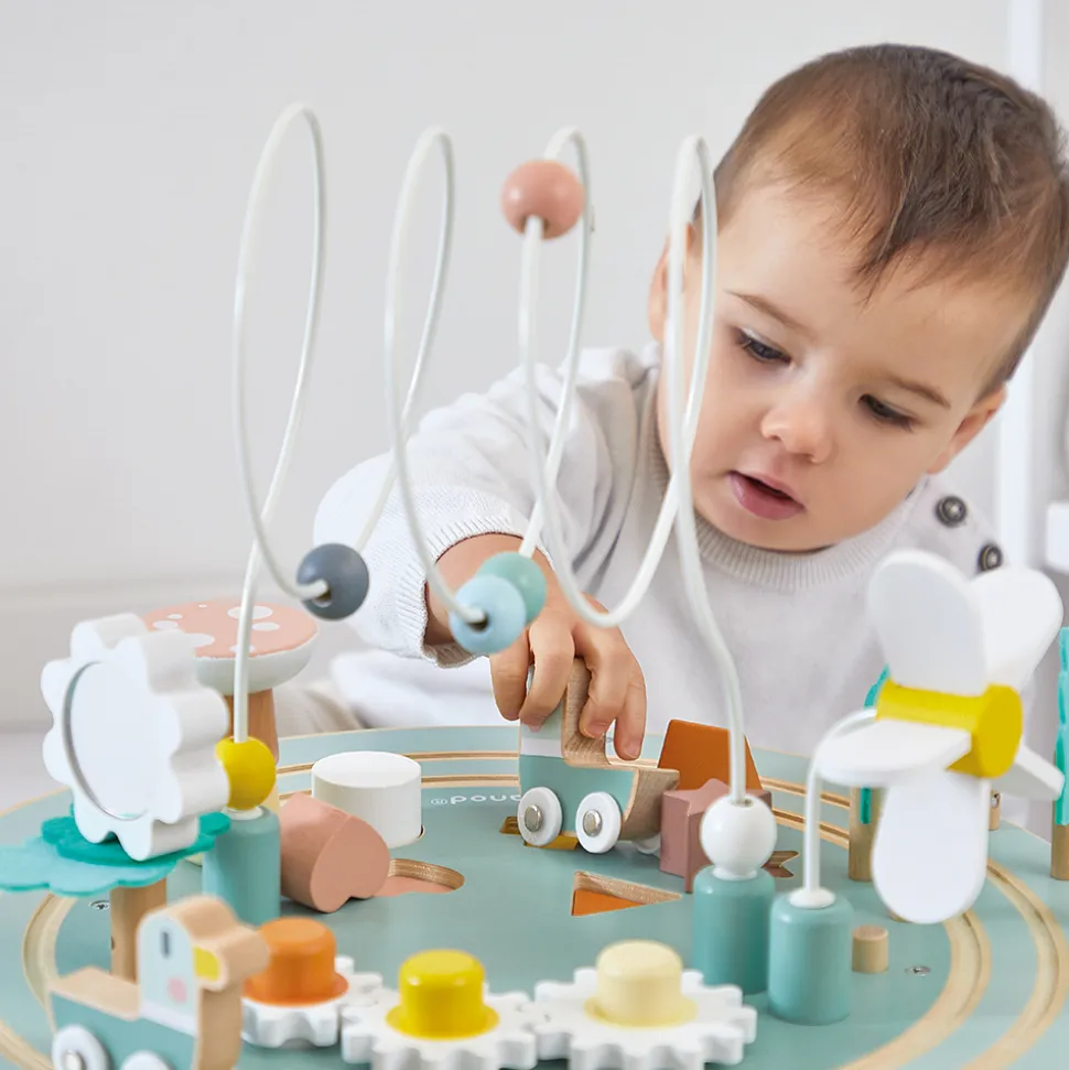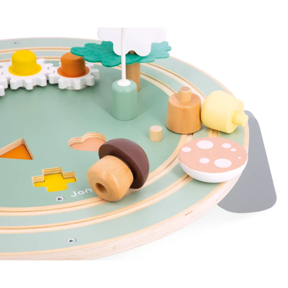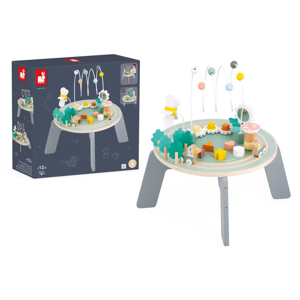 Venez explorer ce jardin aux activités super chouettes ! Sur cette table d’activité se trouve : un champignon géant à empiler, 5 pièces à encastrer, une forêt de feuilles en feutrine, une marguerite géante à empiler avec un miroir dessus pour s’admirer, 1 grand boulier, 3 engrenages en forme de fleurs, un moulin qui tourne lorsque le canard passe dessous et un champignon qui fait crac-crac. En tout, c’est plus de 8 activités qui garantiront des heures de jeu et d’amusement pour les plus petits ! Cette table évolue avec l’enfant, les pieds peuvent être mis en position haute (hauteur du plateau : 22 cm) ou basse (hauteur du plateau : 13 cm), pratique ! Jouet idéal pour que bébé développe sa motricité fine. Jouet d’éveil en bois FSCTM. Pour les enfants à partir de 12 mois.