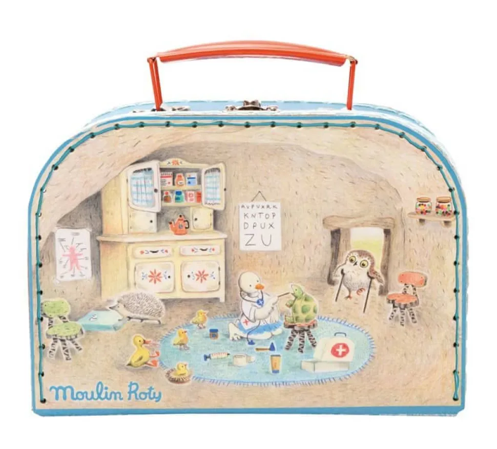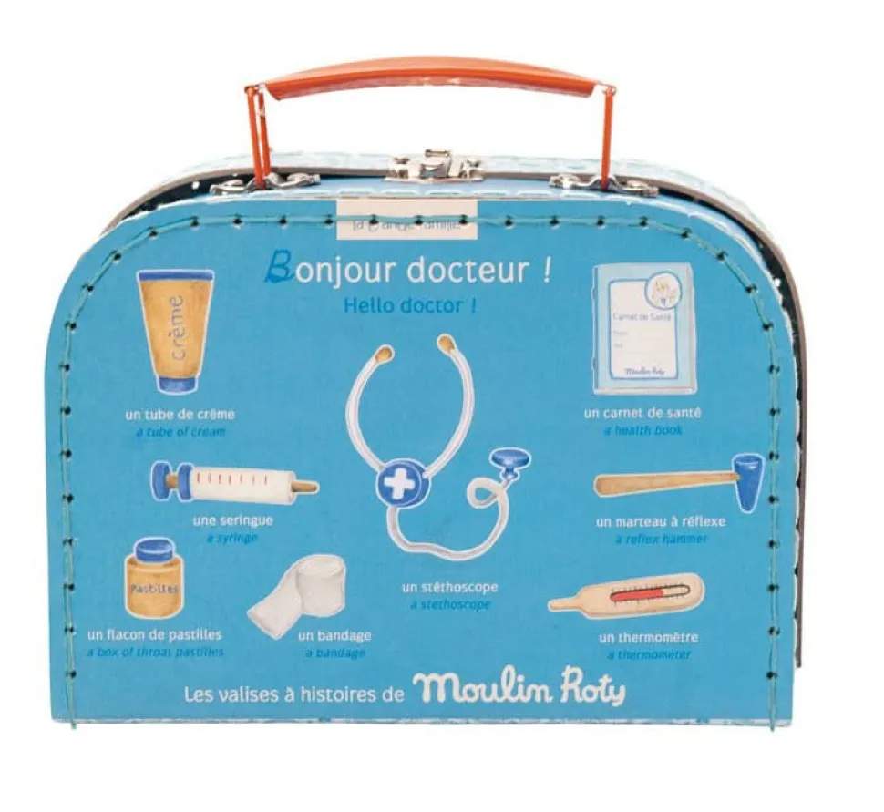 Tous les enfants aiment jouer au docteur et grâce à la valise docteur Moulin Roty, ils vont pouvoir le faire avec ses instruments en bois tels que la seringue pour faire les vaccins, le thermomètre pour prendre la température, le tube de crème pour soigner les petits bobos, le flacon de pastilles pour soulager les maux de gorge, le stéthoscope pour écouter les battements du coeur et le marteau à réflexe pour voir si les genoux et les coudes fonctionnent bien. Sans oublier le bandage et le carnet de santé pour noter tout ce que le petit docteur aura fait à son patient. Il pourra même faire des visite à domicile, grâce à cette valise qui permet de ranger tous les instruments et de les emmener partout.Dès 3 ans. Matières: valise en carton, instruments en bois, bandage en tissu et carnet en papier.