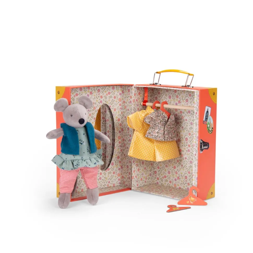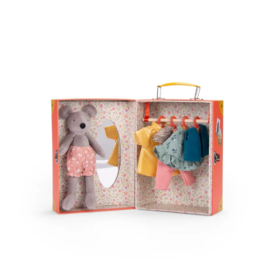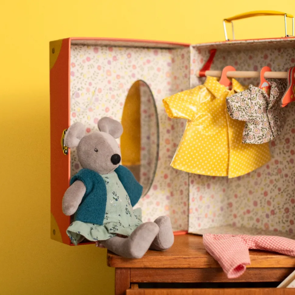 Nini nous invite dans son dressing ! Valise armoire avec miroir intégré, penderie en bois et cintres illustrés, dans laquelle se trouve des habits rangés dans un tiroir. Ciré pour aller sous la pluie, robe ou plutôt pantalon,à vous de choisir sa tenue !