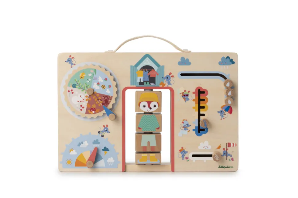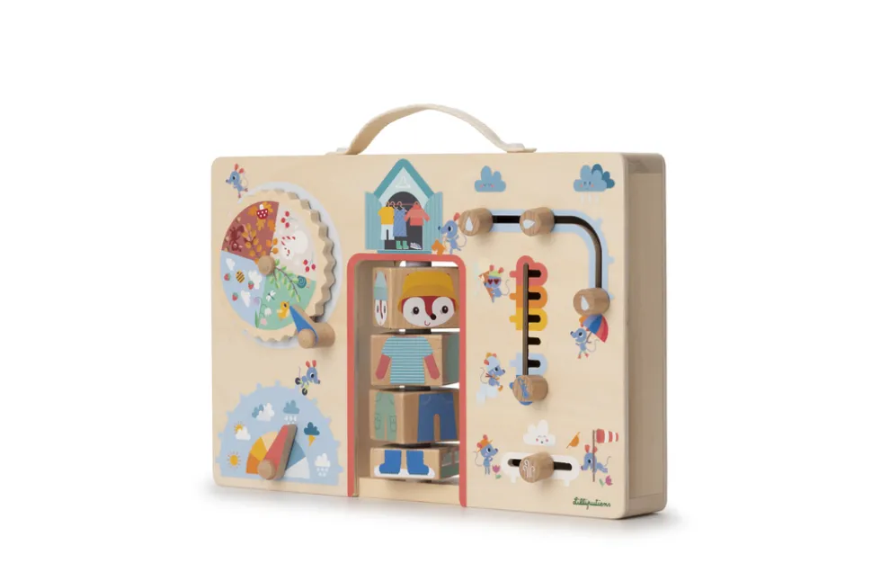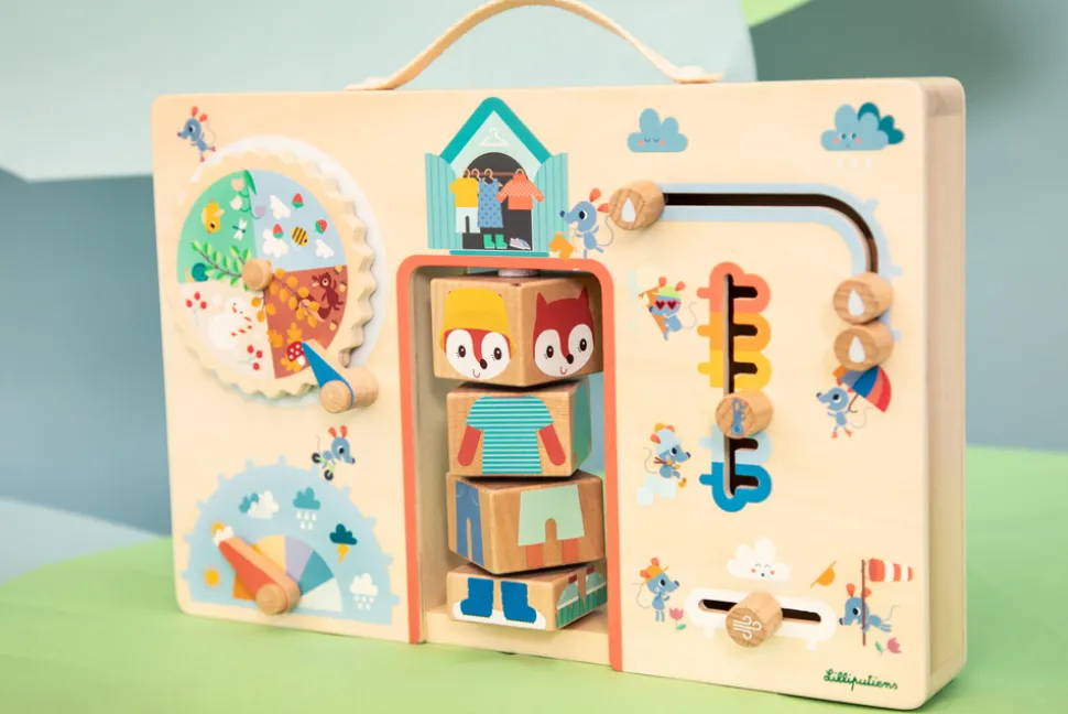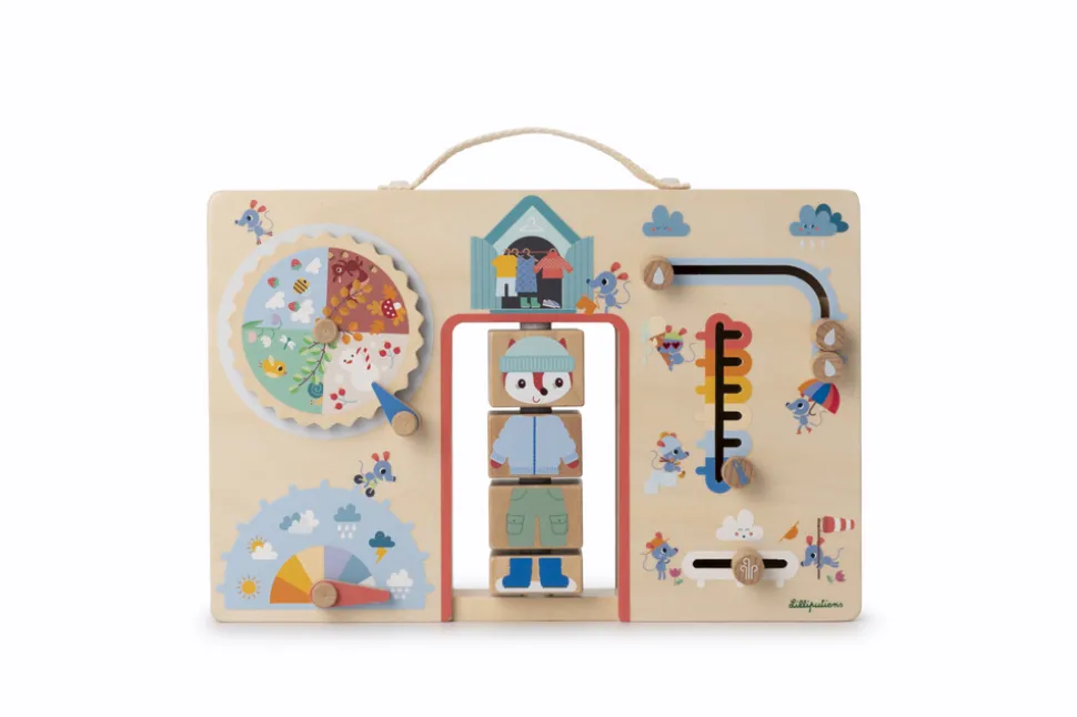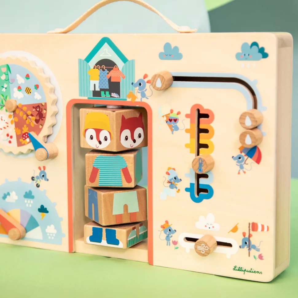 La valisette je m’habille selon la météo de chez Lilliputiens est très ludique et permet à l’enfant d’analyser la météo de la journée. Alice la renarde, composée de 4 blocs en bois, peut être tournée pour s’habiller selon les conditions météorologiques. L’enfant sélectionne la saison, la météo, l’intensité de la pluie et du vent ainsi que la température. Puis il tourne les blocs en bois afin de sélectionner la tenue appropriée. Cet exercice à partir de 2 ans favorise ainsi son autonomie et sa compréhension du monde qui l’entoure.