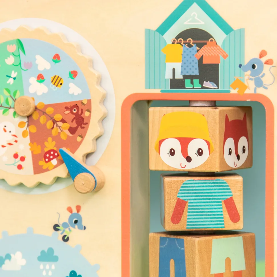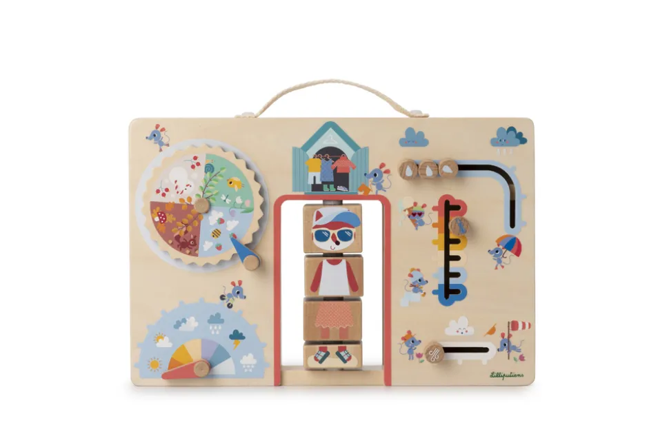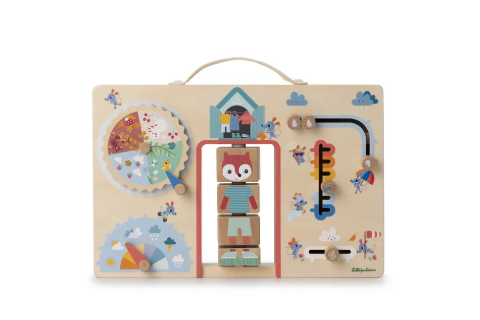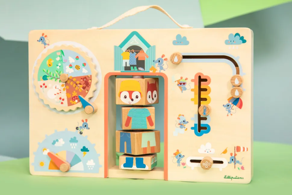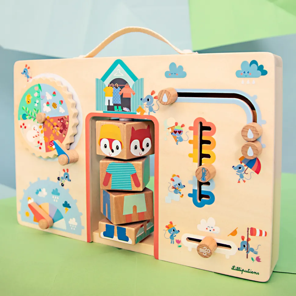 La valisette je m’habille selon la météo de chez Lilliputiens est très ludique et permet à l’enfant d’analyser la météo de la journée. Alice la renarde, composée de 4 blocs en bois, peut être tournée pour s’habiller selon les conditions météorologiques. L’enfant sélectionne la saison, la météo, l’intensité de la pluie et du vent ainsi que la température. Puis il tourne les blocs en bois afin de sélectionner la tenue appropriée. Cet exercice à partir de 2 ans favorise ainsi son autonomie et sa compréhension du monde qui l’entoure.